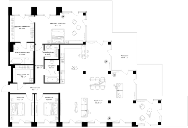 Жилая площадь 234 м2, кухня 8 м2, квартира без отделки, комнаты изолированные, совмещенных санузлов - 1, балконов - 1.