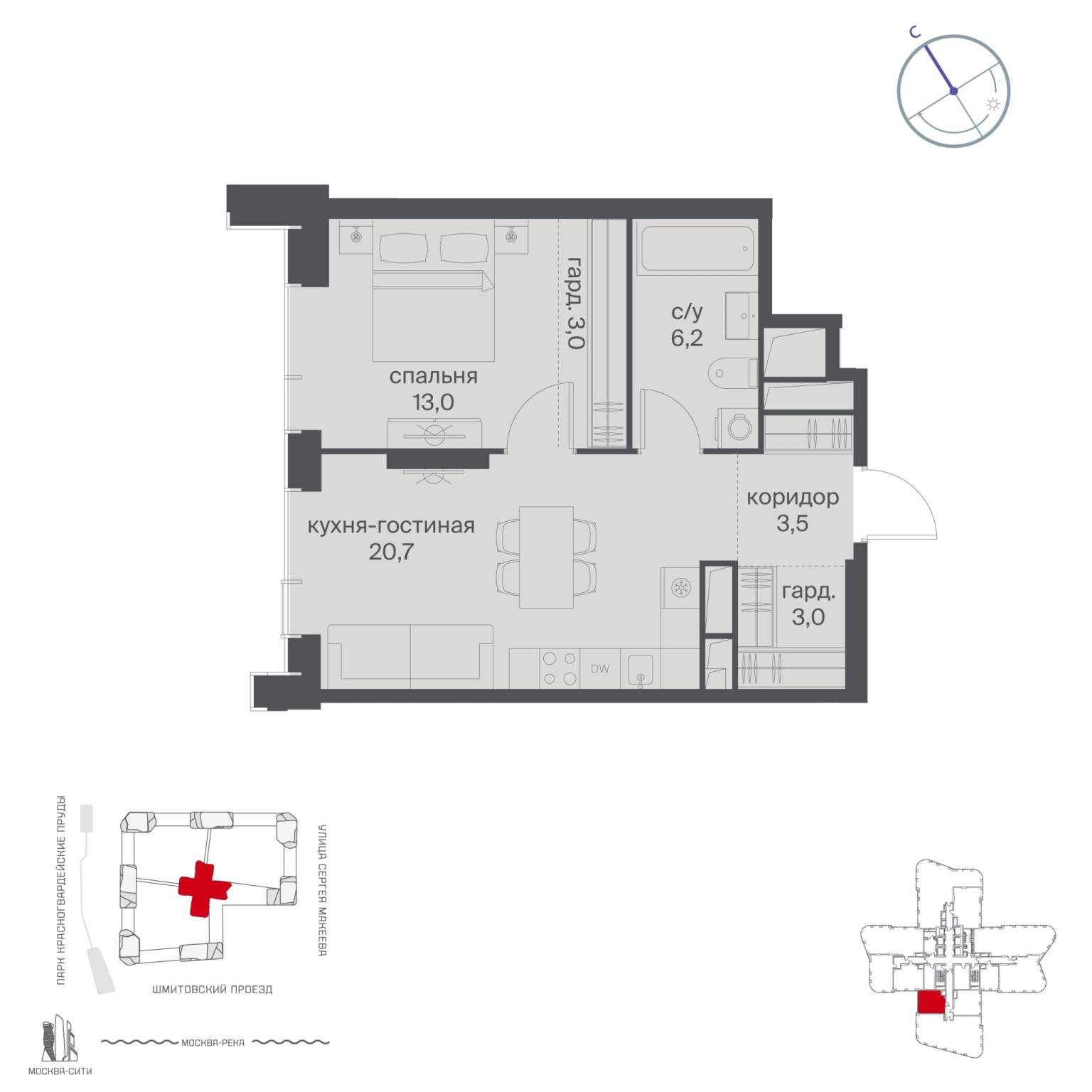 Жилой проект расположен в Пресненском районе Москвы. В пешей доступности находятся станции метро: «Улица 1905 года» (19 минут) , «Москва-Сити» (24 минуты) и «Деловой центр (Выставочная) » (25 минут) .