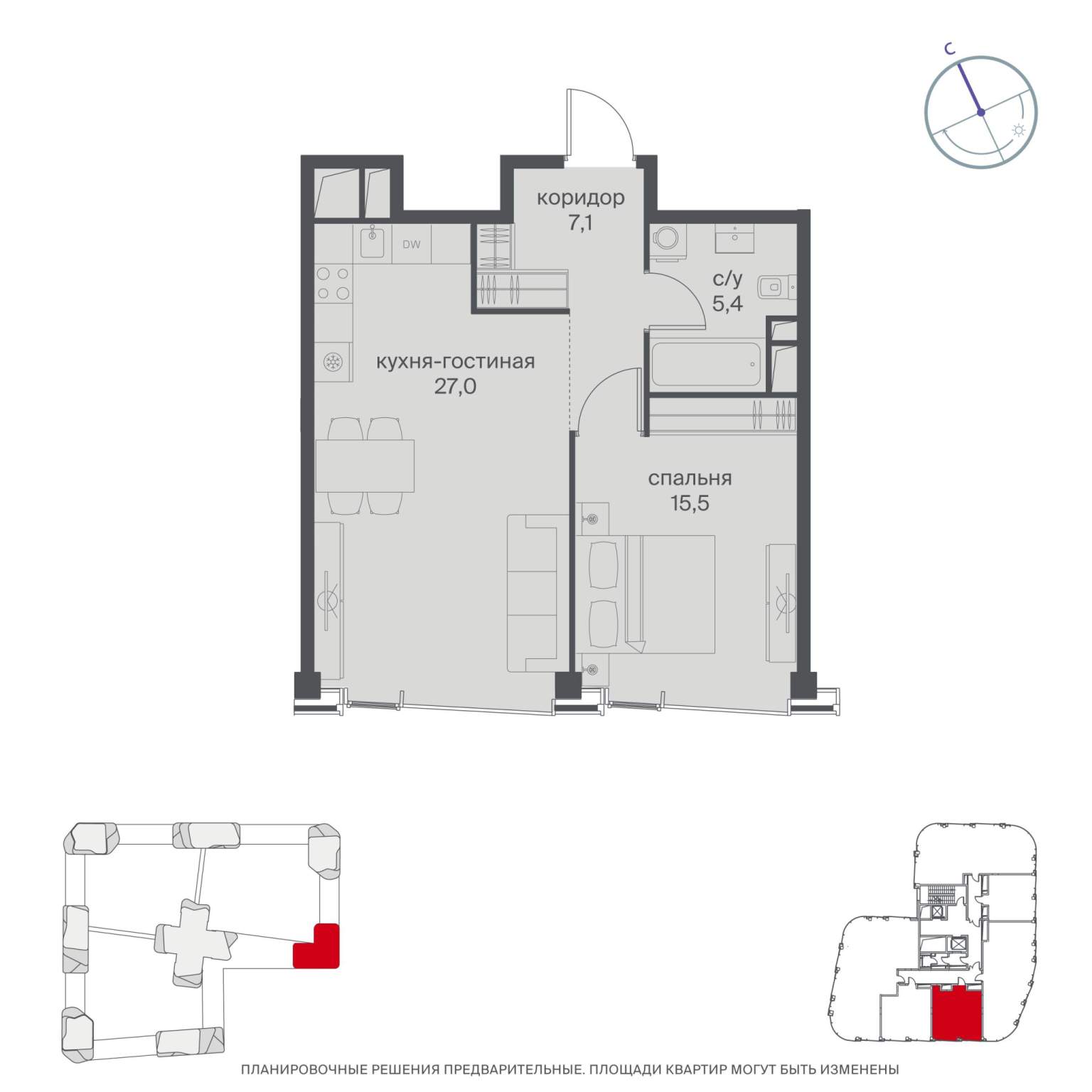 Квартира располагается на 20 этаже 48-этажного дома в ЖК Начало.