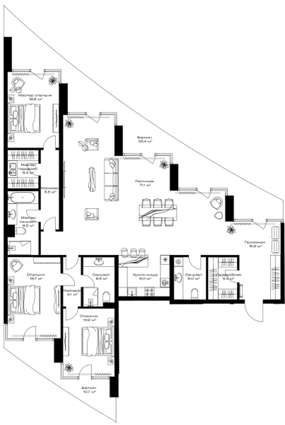 Жилая площадь 161 м2, кухня 49 м2, квартира без отделки, комнаты изолированные, совмещенных санузлов - 1, балконов - 1.