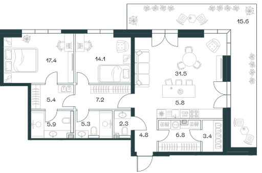 Жилая площадь 82 м2, кухня 25 м2, квартира без отделки, комнаты изолированные, совмещенных санузлов - 1, балконов - 1.