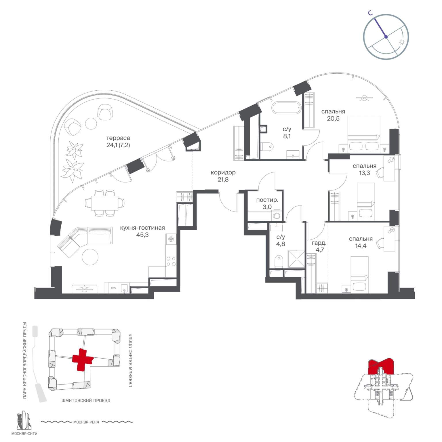 Подземная парковка, парковка охраняется. Обеспечение безопасности: видеонаблюдение, круглосуточная охрана, консьерж, противопожарная система, пропускная система. Инфраструктура: школа, детский сад, поликлиника, спортивные площадки, места для отдыха, рестораны, фитнес-центр, пункты бытового обслуживания.