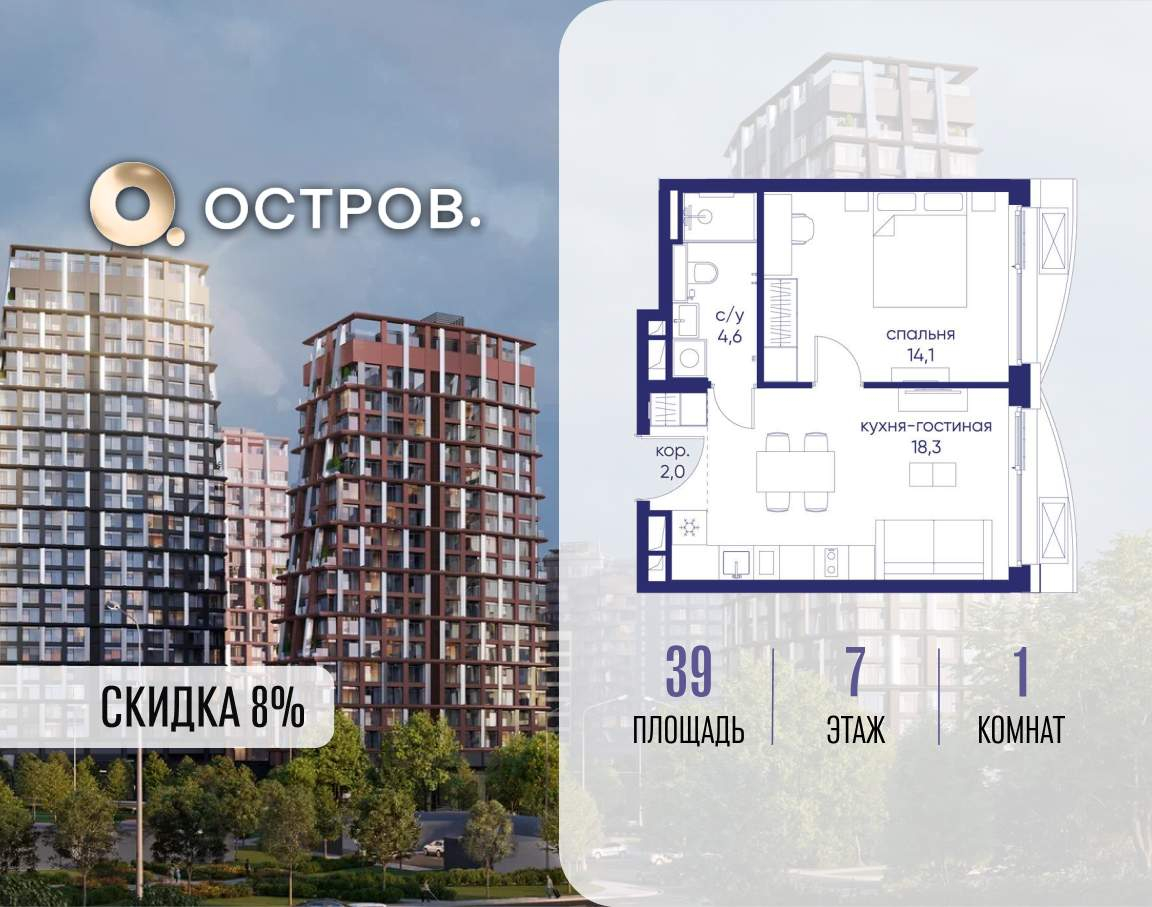 Продаётся 1-комн. квартира от застройщика: общая площадь 39.00 м, жилая 14.10 м, кухня 18.30 м, 7-й этаж, жилой квартал «Остров 14», корпус 1 (секция 1) . Срок сдачи: 2 квартал 2029 года.