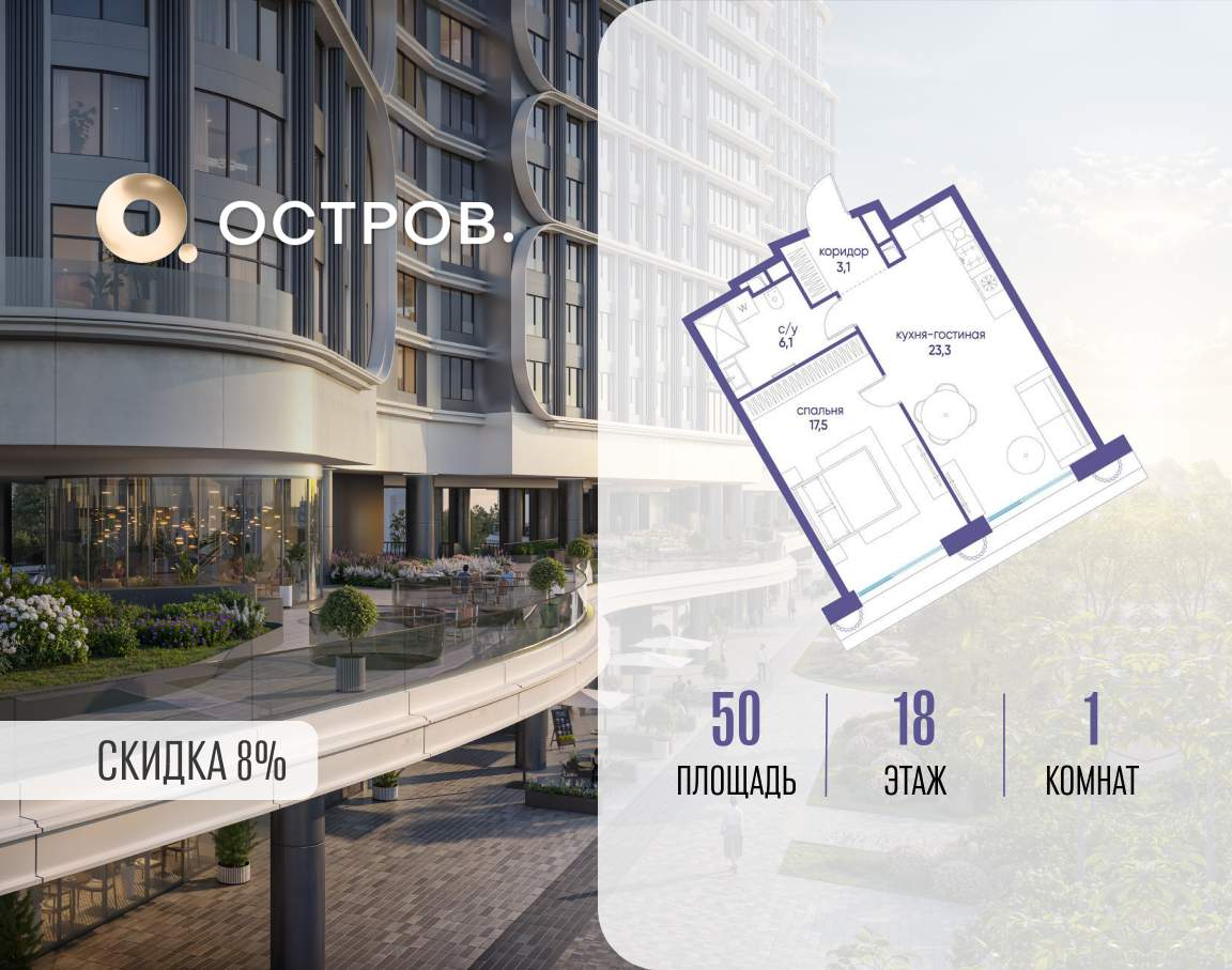 Продаётся 1-комн. квартира от застройщика: общая площадь 50.00 м, жилая 17.50 м, кухня 23.30 м, 18-й этаж, жилой квартал «Остров 7», корпус 7 (секция 2) . Срок сдачи: 3 квартал 2028 года.