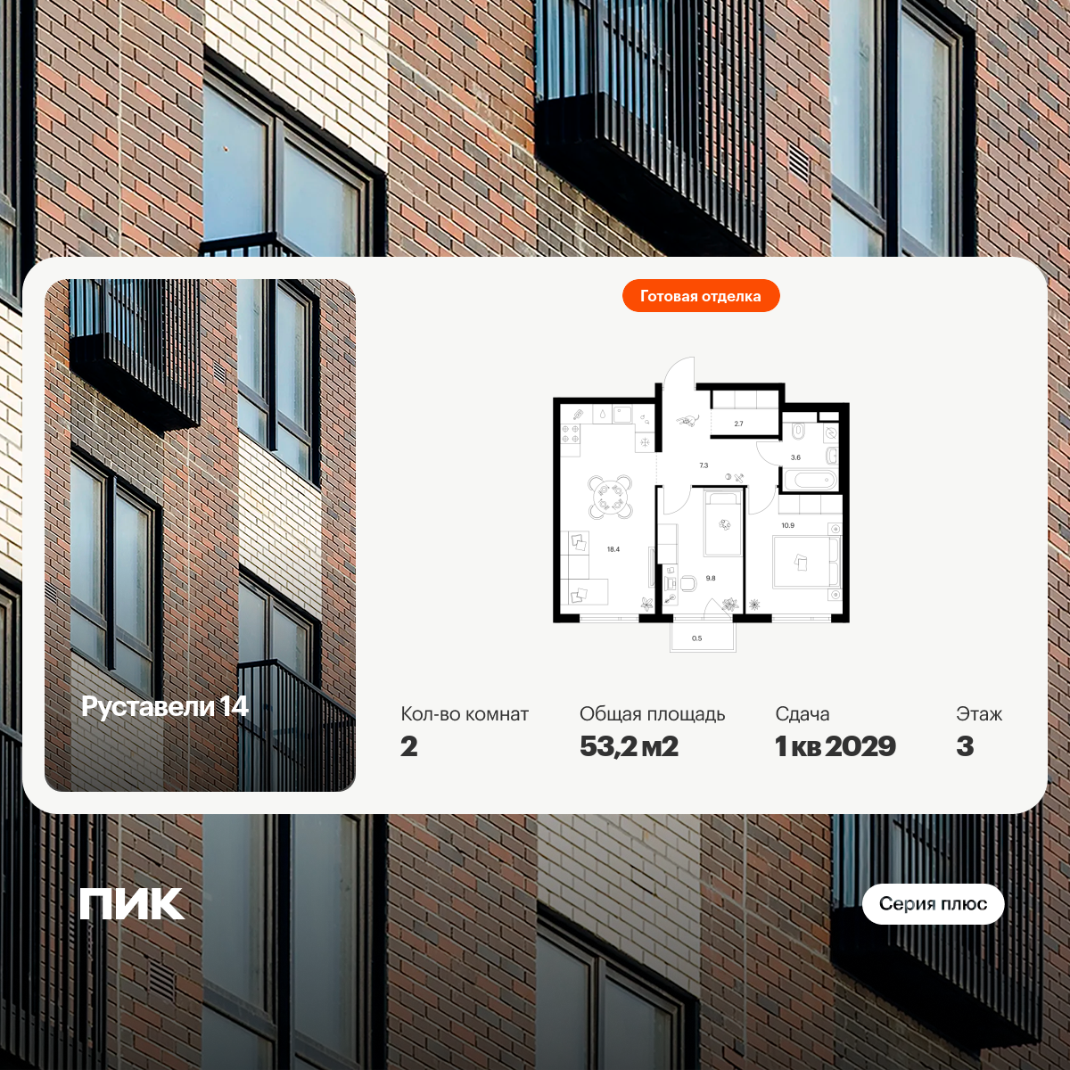 Купить 2к квартиру 51 м² в ЖК Руставели 14