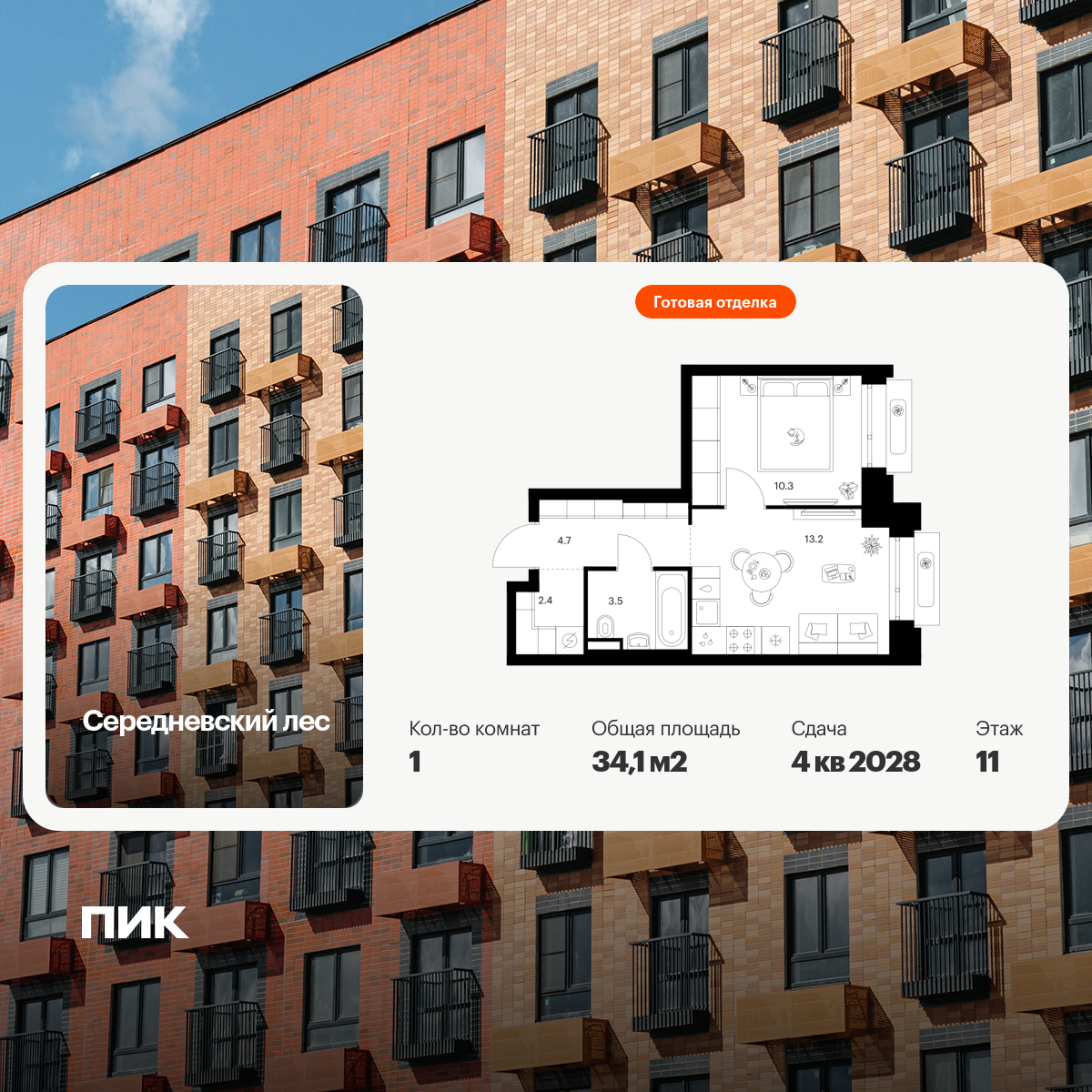 Продаётся 1-комн.квартира площадью 36.85 кв.м на 4 этаже 9 этажного дома (Корпус 4.1, секция 2) проекта ПИК Ильинские луга. Светлый просторный подъезд на уровне земли, функциональная планировка, большие окна, с отделкой.