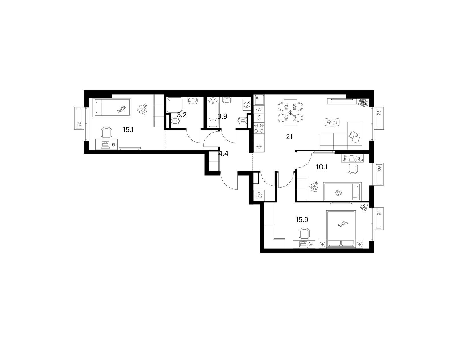 В проекте «Митинский лес» широкий выбор планировок: от компактных и продуманных студий до просторных четырёхкомнатных квартир для большой семьи. Есть варианты с кухней-гостиной, гардеробной, постирочной и двумя санузлами. Для тех, кому важно дополнительное пространство, есть планировки с балконом или собственной лоджией.