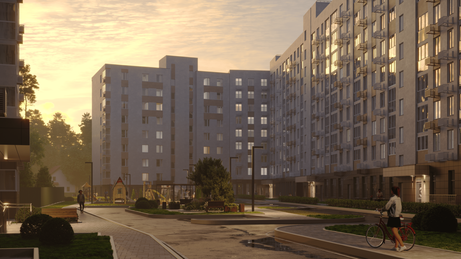 В квартале есть всё необходимое для комфортной жизни: две школы, поликлиника и пять детских садов. По центру квартала проходит широкий пешеходный бульвар для отдыха и прогулок.