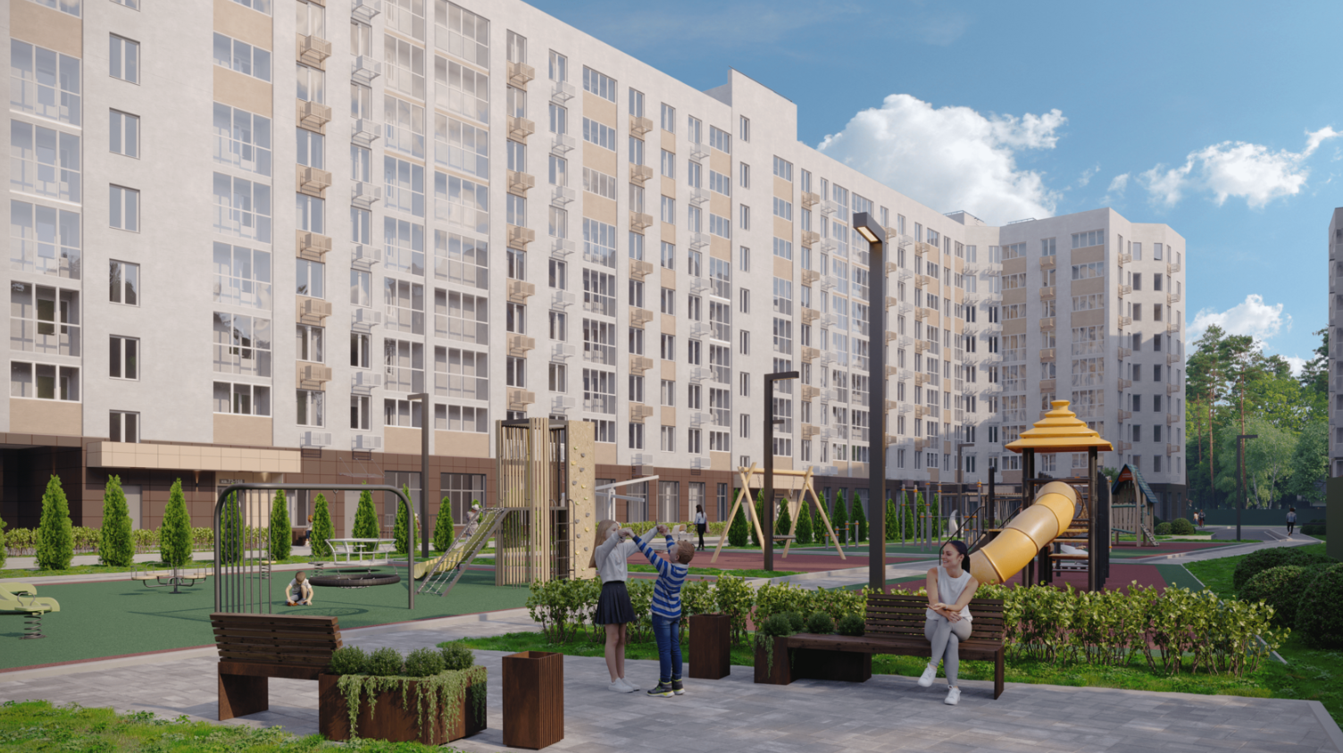 Во дворах — зелёные парки с местами для отдыха, спортивными и игровыми площадками. Ещё для детей в проекте есть ПлейХаб «Ферма» — масштабная площадка с лазательным комплексом, качелями, двухэтажным детским домиком и песочницей. На первых этажах домов — магазины, кафе и полезные сервисы.