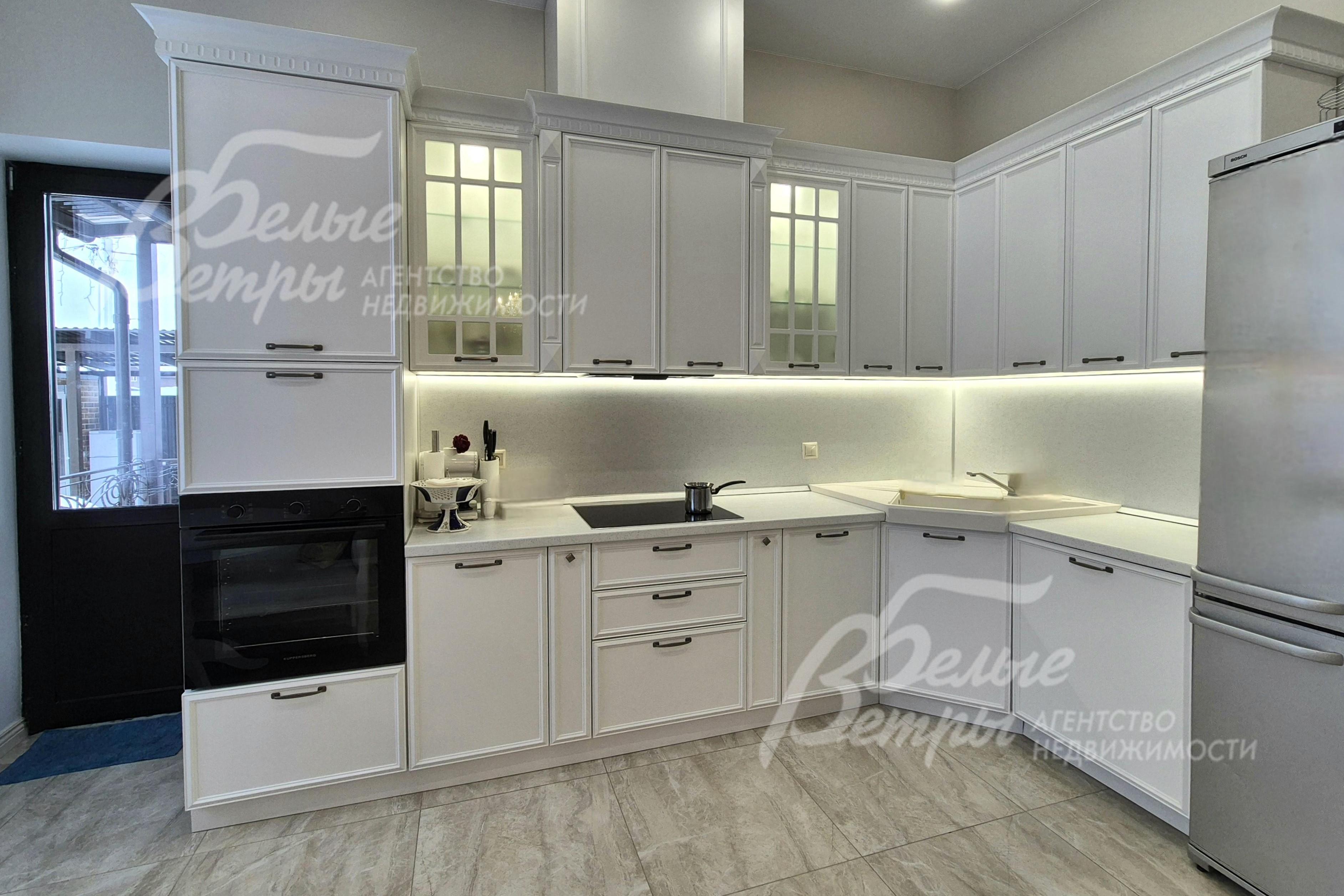 Мебель, оборудование: в гостиной классический мягкий гарнитур с элементами из массива, в зоне столовой обеденная группа на 6 персон, в спальнях гарнитуры с двуспальными кроватями, тумбами и шкафными группами, при входе вместительные шкафы с фасадами МДФ с эмалью. Кухонный гарнитур в стиле Прованс белого цвета, фасады крашеные МДФ с эмалью, встроенная техника: электрическая варочная панель, духовой шкаф и посудомоечная машина (60 см) Kuppersberg, холодильник BOSCH, микроволновая печь. Стиральная машина BOSCH на 7кг, телевизор TCL (QLED) 65 дюймов, пылесос. Оригинальные люстры в общей стилистике дома, встроенные потолочные споты..