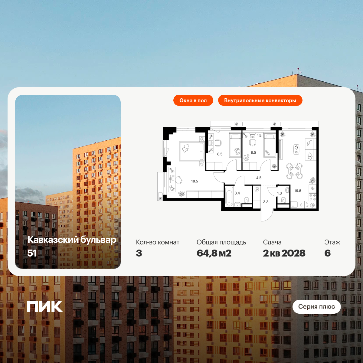 Комфортный микроклимат в квартирах обеспечивают современные инженерные решения. Для удобства жителей предусмотрен двухуровневый подземный паркинг на 270 машиномест.