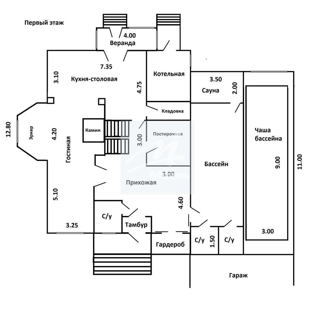 Первый этаж - прихожая, две спальни, два санузла, кухня, столовая, зимний сад, каминный зал, бильярдная, сауна, комната отдыха, теплый гараж;
