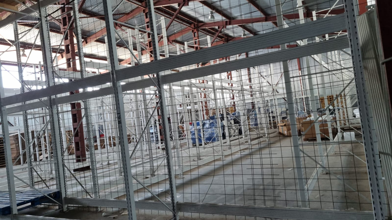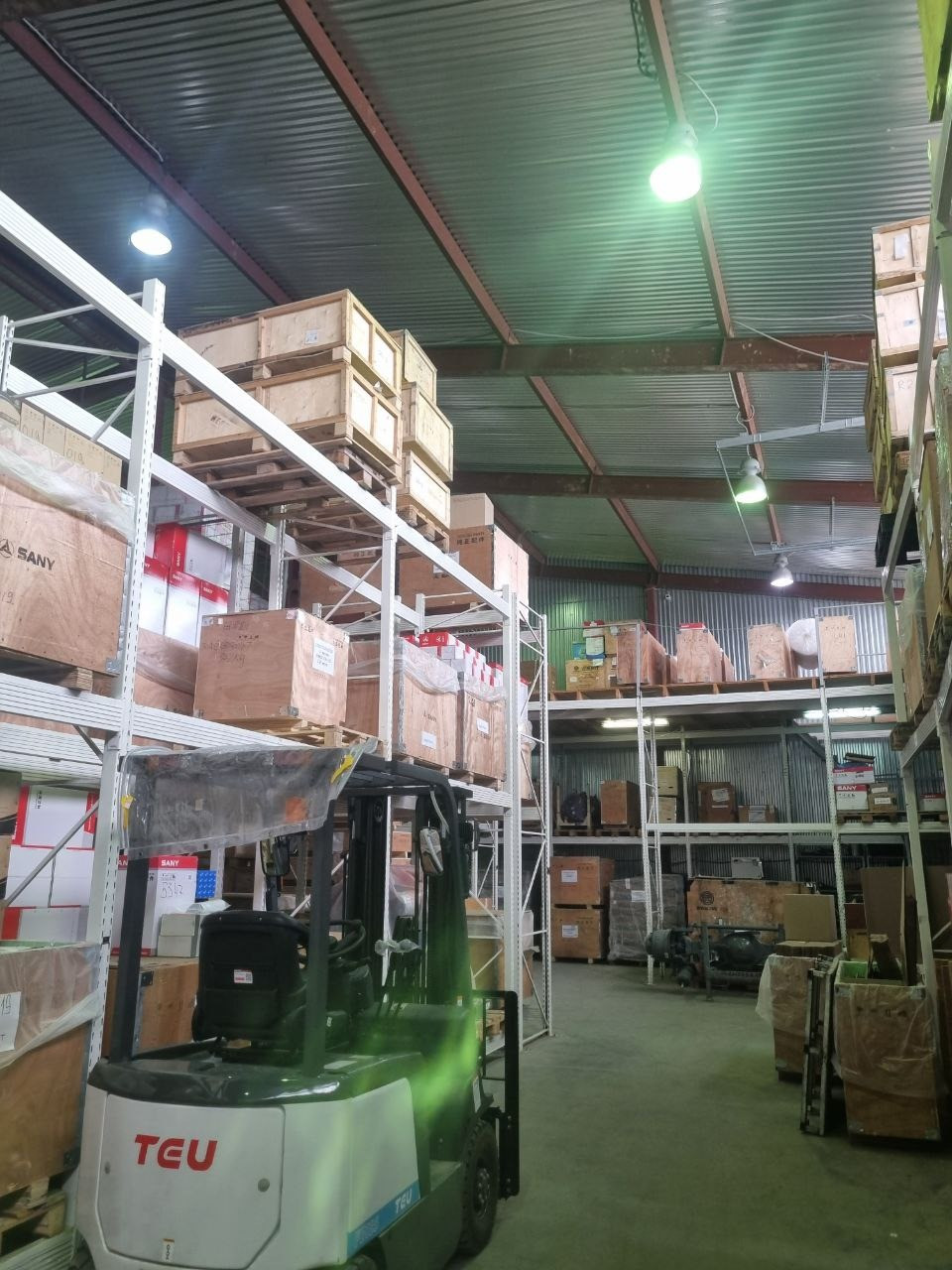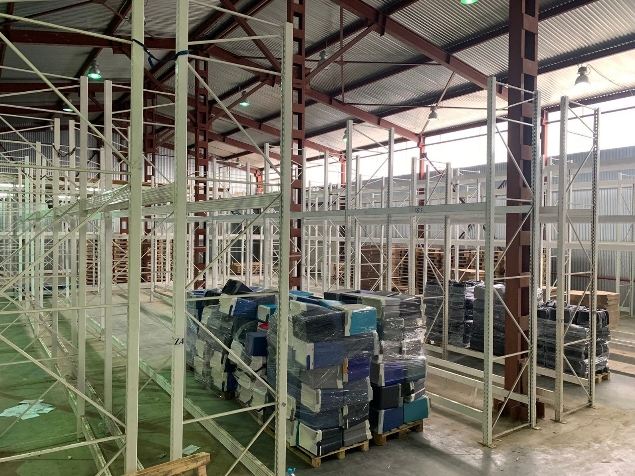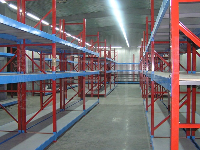 Профессиональные 3-ярусные стеллажи, высотой 4-5 м., допустимая нагрузка на ярус - 3 тонны.