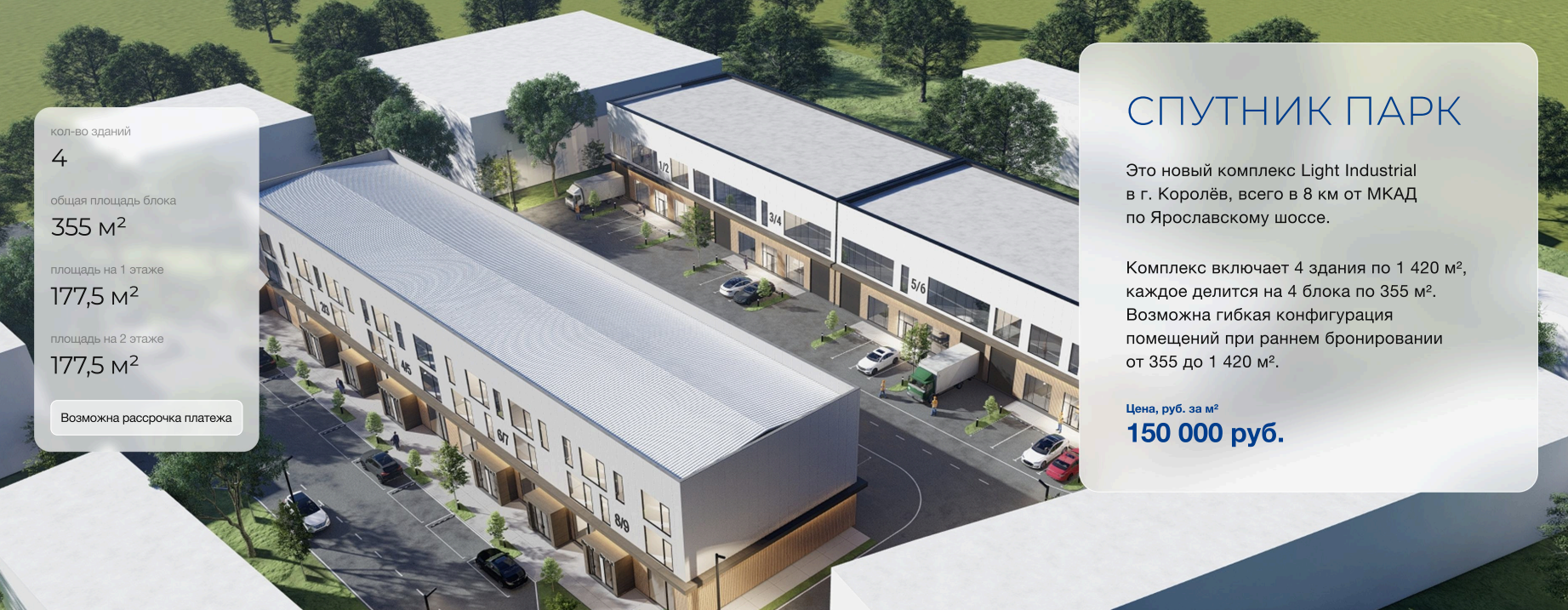Комплекс включает 4 здания по 1 420 м², каждое делится на 4 блока по 355 м².
