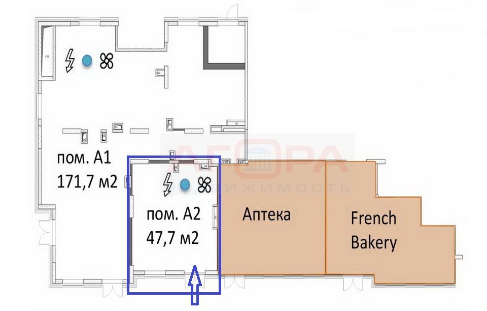 Аренда торгового помещения площадью 47,7 м2, расположенного на 1-м этаже в комплексе апартаментов Онли (на плане - помещение № А2), в секции А. Панорамное остекление, состояние – с отделкой. Помещение имеет отдельный вход, есть мокрая точка. Выделенная мощность 20 кВт. Высота помещения 4,5 м. Все центральные коммуникации. Дополнительно оплачиваются: эксплуатационные расходы в УК жилого комплекса, в размере 10 000 руб/мес (УСН) и коммунальные платежи – электричество по факту потребления.
