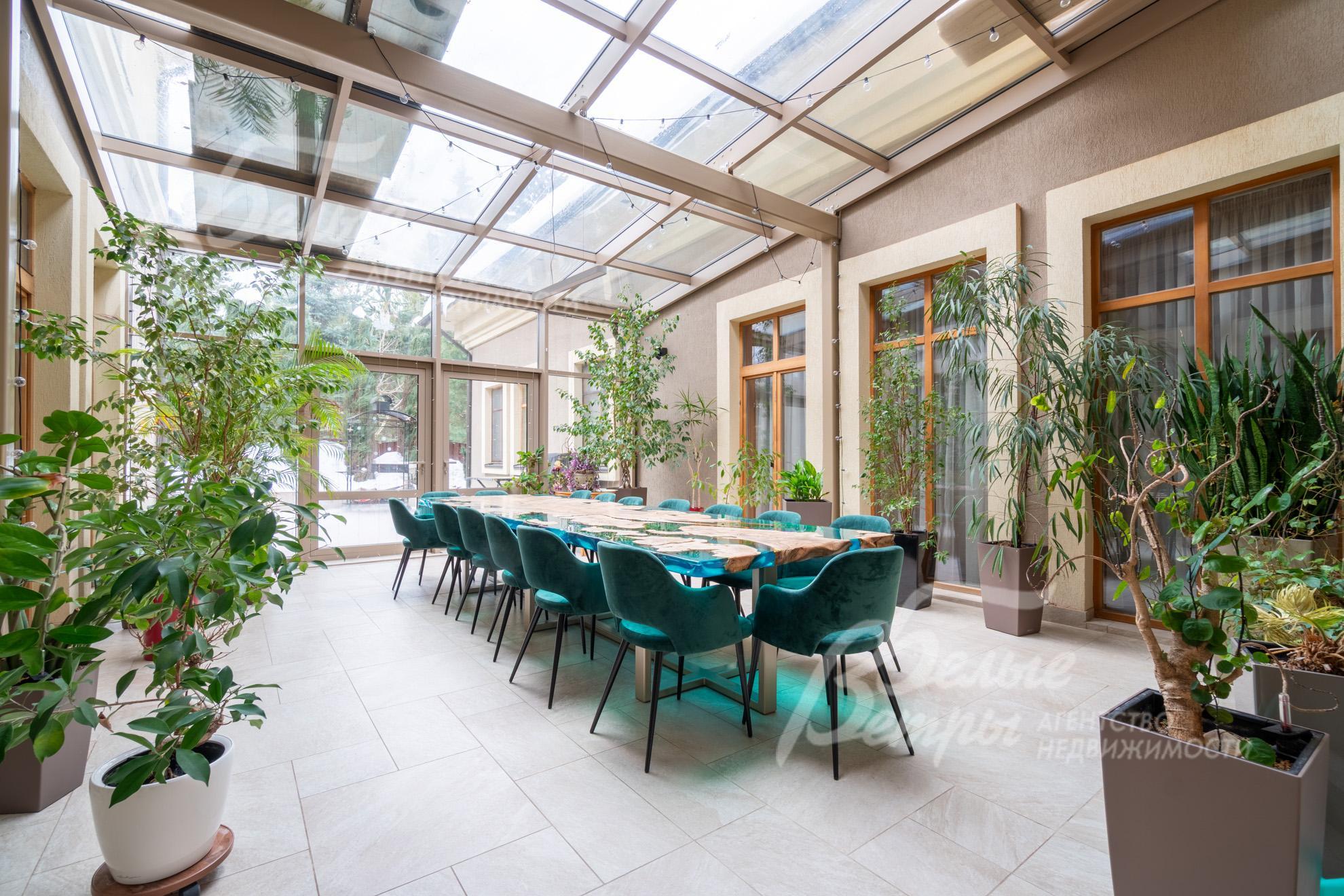 Мебель, оборудование: Дом полностью меблирован: в столовой обеденный стол на 8 персон со столешницей из кварцевого агломерата с дорогими мягкими стульями/креслами, в гостиной основного дома и блока для персонала, а также в одной из гостевых спален - мягкие гарнитуры с обивкой из велюра, в спальнях двуспальные кровати, тумбы, комоды, гардеробные, оборудованные новыми современными системами хранения. В закрытой террасе на первом этаже большой стол 3.93х1.15м на 16 персон со столешницей из эпоксидной смолы, на террасе второго этажа и в спа-зоне стильная плетеная мебель. В основной кухне П-образный кухонный гарнитур с большой рабочей поверхностью, глянцевыми фасадами бежевого цвета и всей необходимой встроенной техникой: два однокамерных холодильника в цвет гарнитура, посудомоечная машина (60 см), электрическая варочная панель, духовой шкаф, микроволновая печь, вытяжка.