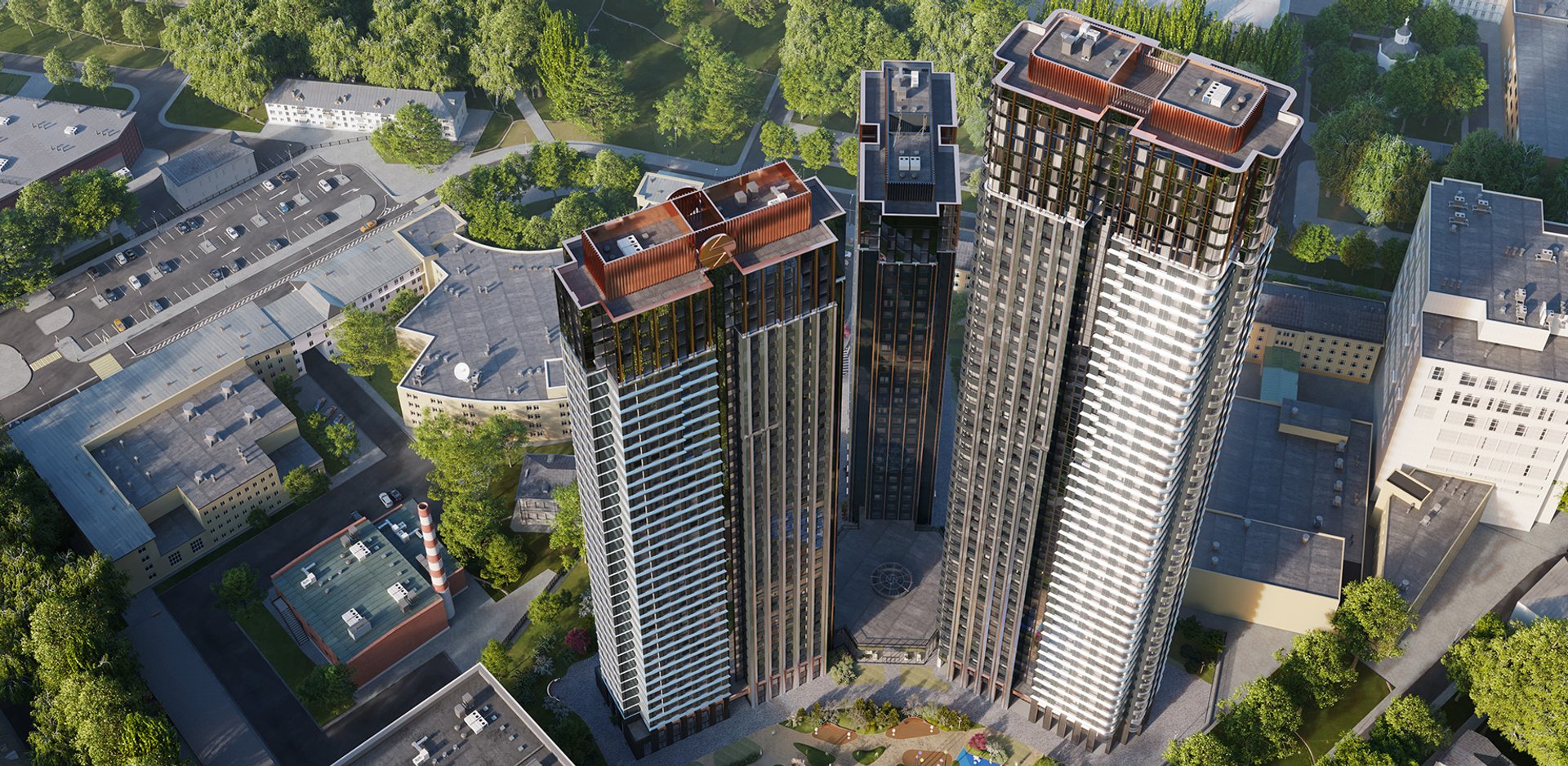 Идея проекта вдохновлена темой археологических раскопок и многослойности культурных срезов разных исторических периодов. А в основе архитектурного решения концепция вычитания объемов и противопоставления внешнего и внутреннего.Внешний фасад строгий, ритмичный, регулярный. Он облицован панелями из анодированного алюминия, символизирует строгость и идеальность. В противовес ему внутренний объем из кирпича будто бы грубо высеченный самой природой. Расстановка окон нерегулярна, хаотично выступающие объемы французских балконов, большое количество террас, джамбо-окна, фактурная глубокая облицовка и сложные контуры очертаний — все эти приемы помогают создать эффект рукотворности, результат кропотливой многовековой обработки.
