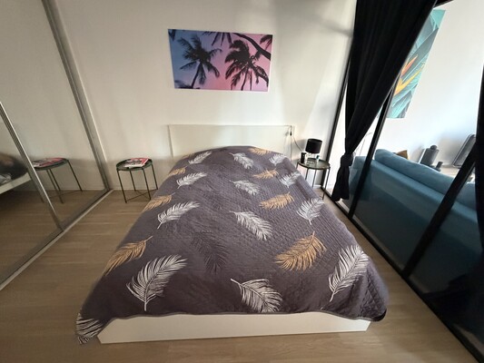 В квартире свежий ремонт с использованием качественных материалов, пластиковые окна, натяжные потолки, кондиционер. В санузле керамическая плитка и керамогранит, на полу ламинат. Комната зонирована на спальную зону и гостиную с выходом на балкон. Мягкая мебель, шкафы и кухонный гарнитур останутся новому владельцу.