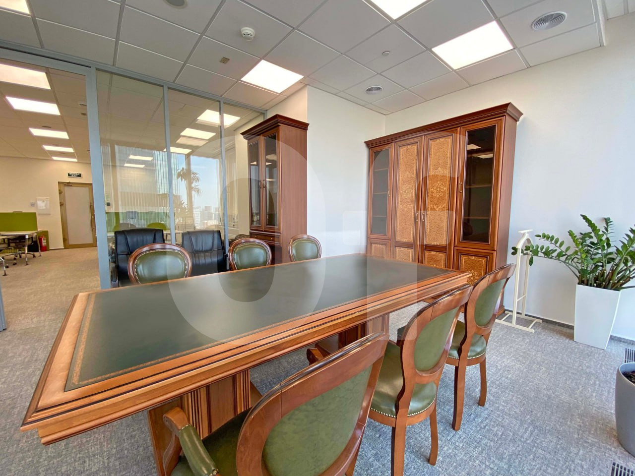 Панорамный вид, переговорная комната, зона руководителя, с мебелью.