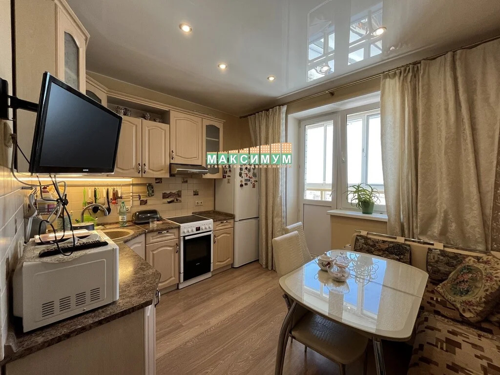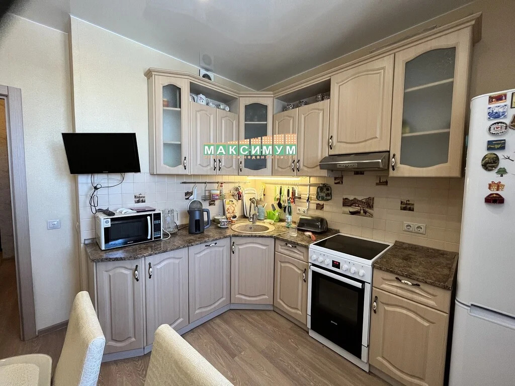 Кухня: кухонный гарнитур, стол, 4 стулья, кухонный уголок, холодильник, электроплита, вытяжка, микроволновая печь, электрический чайник, телевизор, посудомойка.