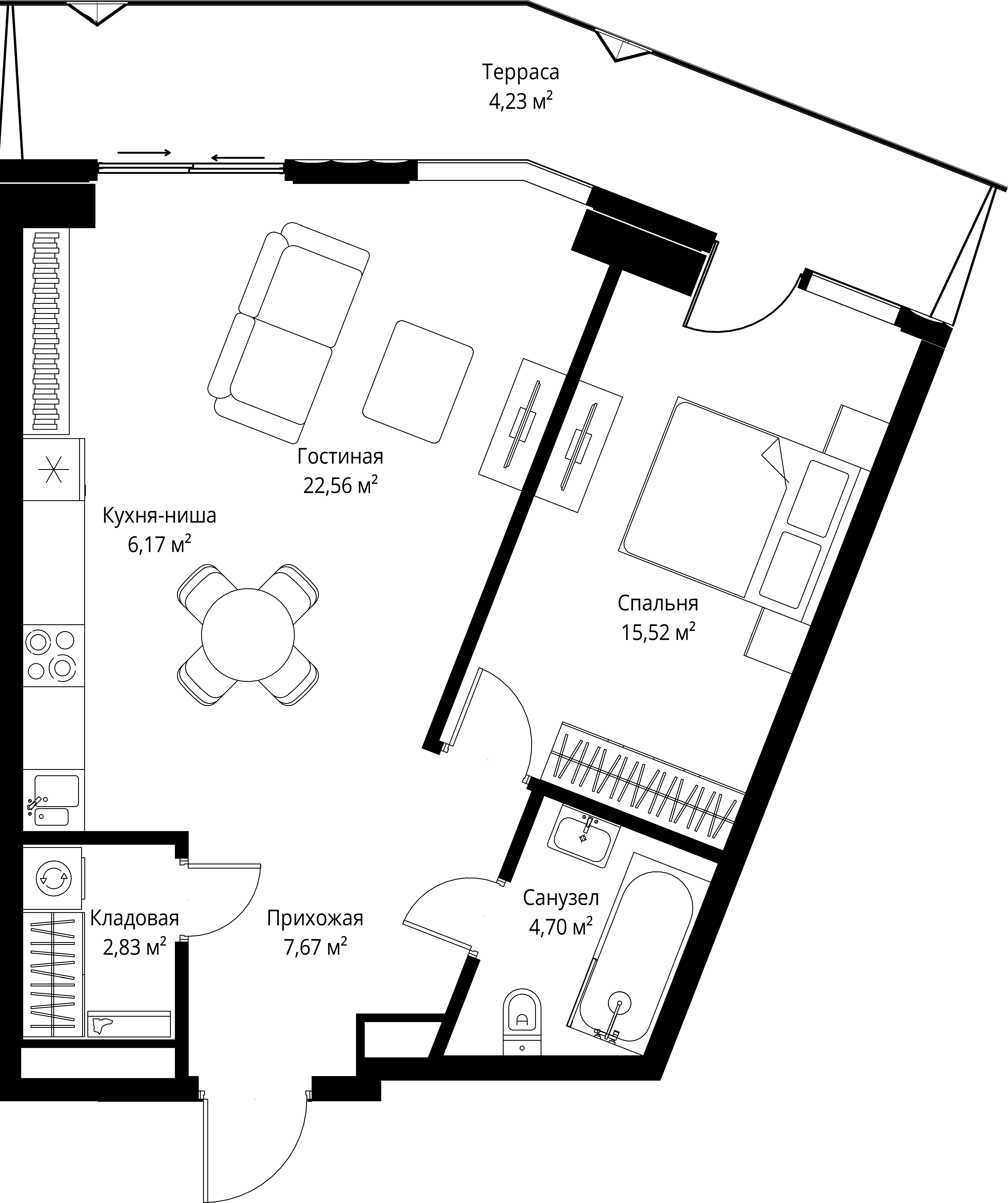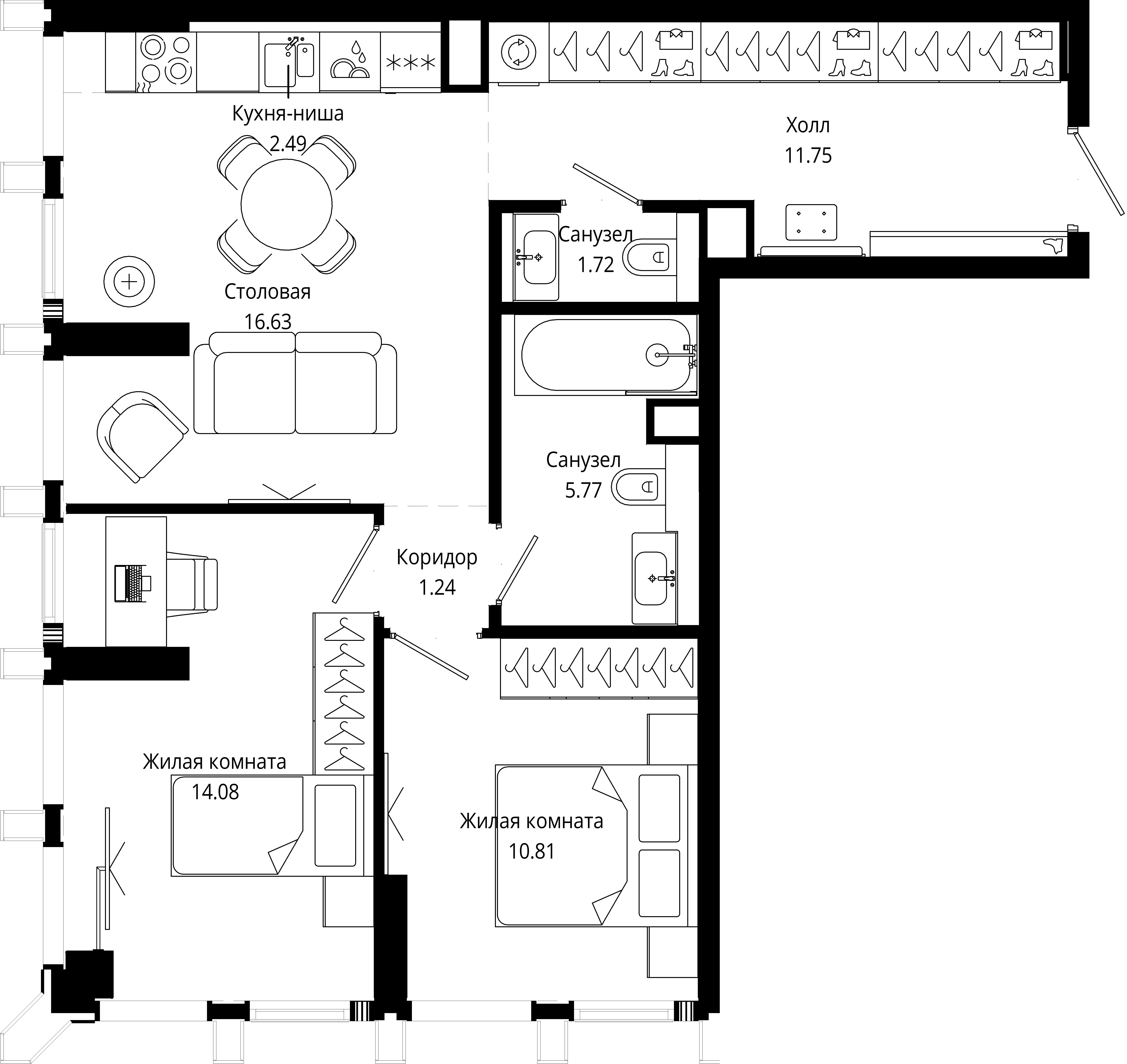2 совмещенных санузла. В жилой зоне 2 больших окна на одну сторону, хорошая инсоляция.