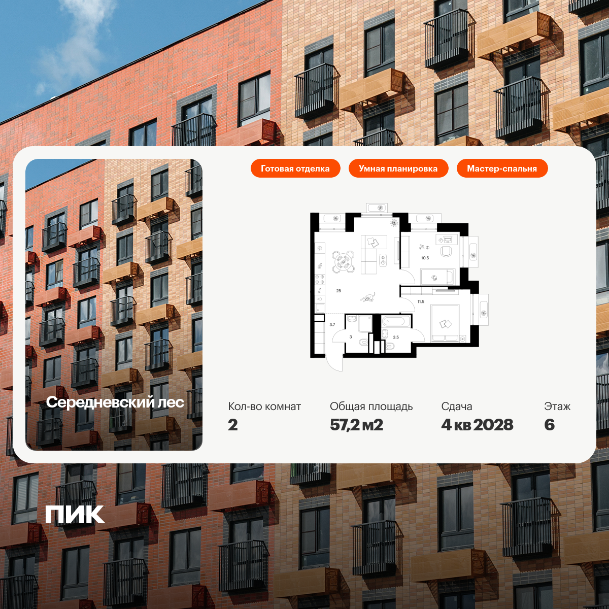 Продаётся 2-комн.квартира площадью 57.00 кв.м на 9 этаже 9 этажного дома (Корпус 4.3, секция 5) проекта ПИК Ильинские луга. Светлый просторный подъезд на уровне земли, функциональная планировка, большие окна, с отделкой.
