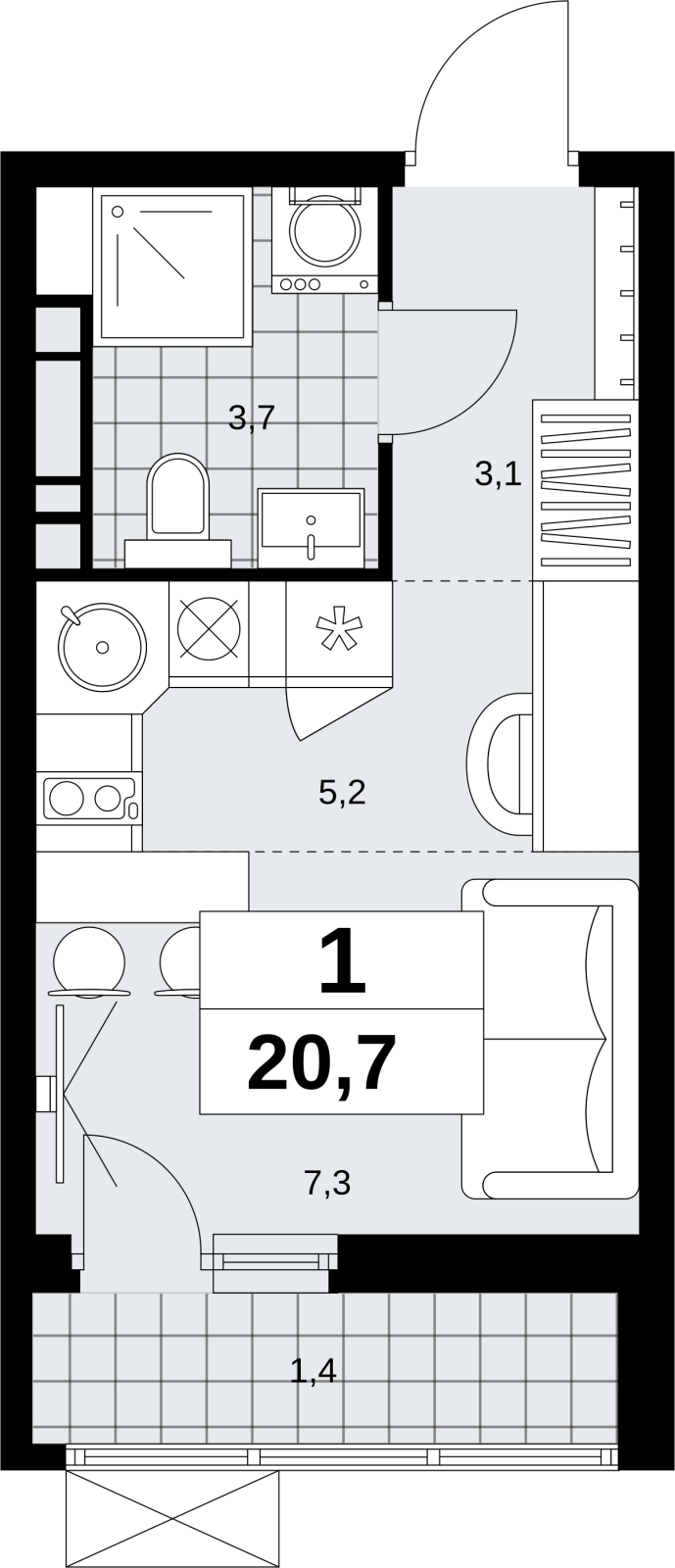1-комн. квартира-студия в ЖК "Бунинские кварталы" на 7 этаже. Квартира без отделки, новый владелец может сделать ремонт по индивидуальному проекту. Общая площадь: 23.5 кв.м., площадь гостиной 13.9 кв.м., из которых 5.8 кв.м. выделено под кухонную зону. Все окна выходят на одну сторону. В квартире один балкон, один совмещенный санузел. Высота потолков 2.8 м.