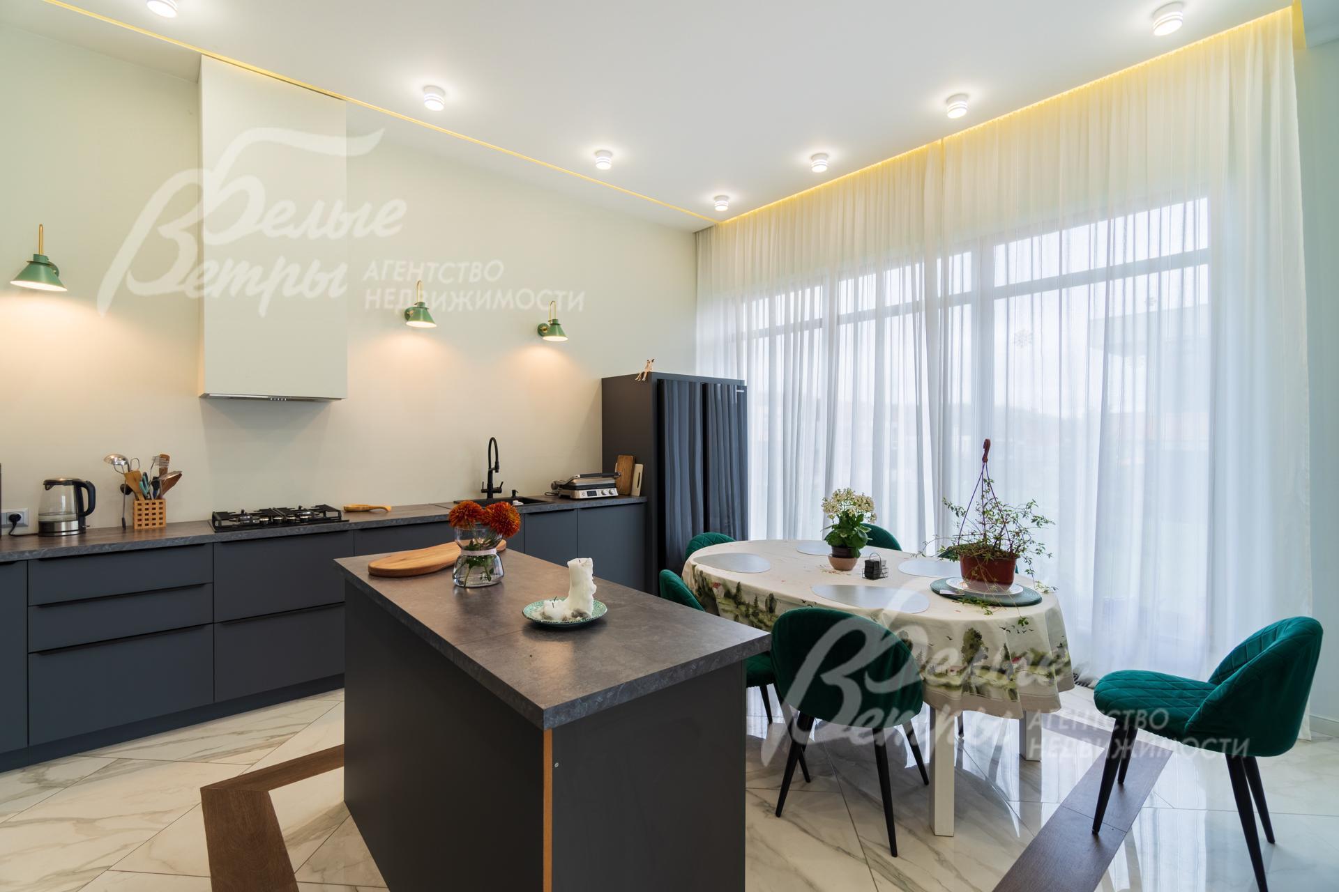 Мебель, оборудование: кухонный гарнитур с островом, эмалированные фасады из МДФ, столешница из искусственного камня. Вся необходимая встроенная техника: газовая варочная панель, духовой шкаф, двухдверный холодильник Side-by-Side, посудомоечная машина, стиральная машина, в гостиной большой современный телевизор. В столовой обеденная группа на 6 персон с мягкими креслами, в гостиной П-образный раскладной диван с обивкой из велюра. Возможно будет дополнить мебель под арендатора. В гостиной панорамное остекление закрыто тюлем. Установлена скрытая светодиодная подсветка, точечные споты, движущиеся споты на рейлингах, люстры..