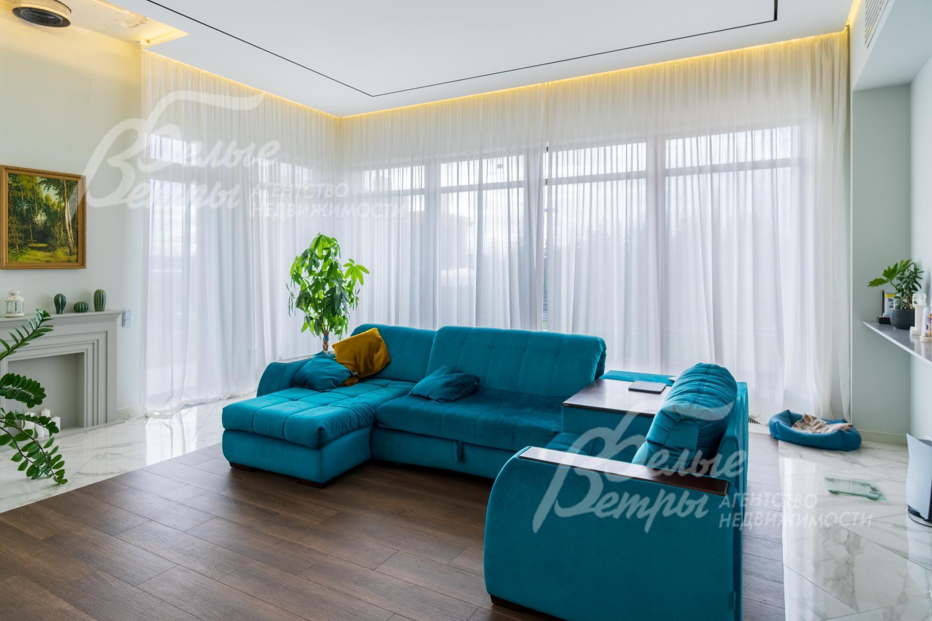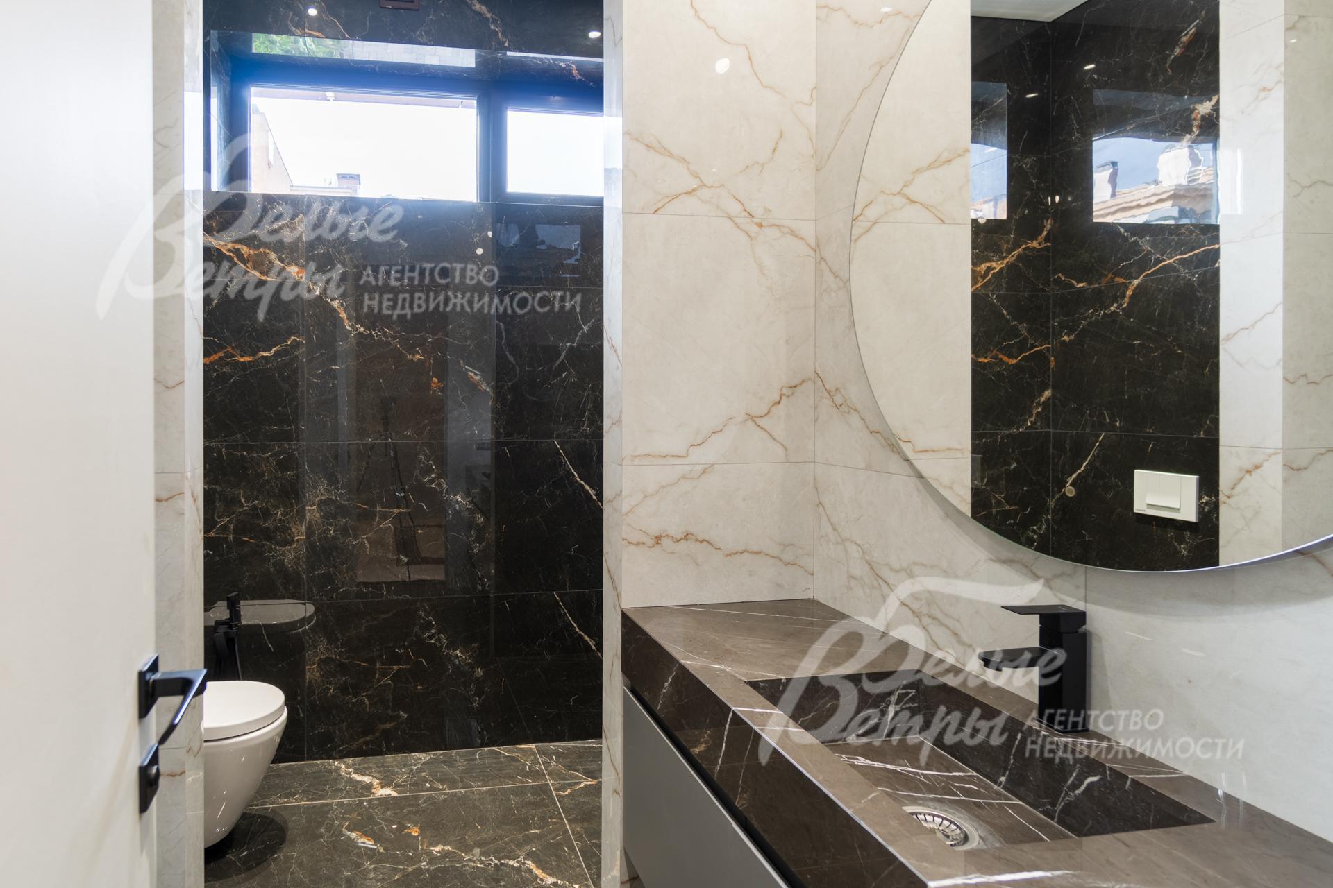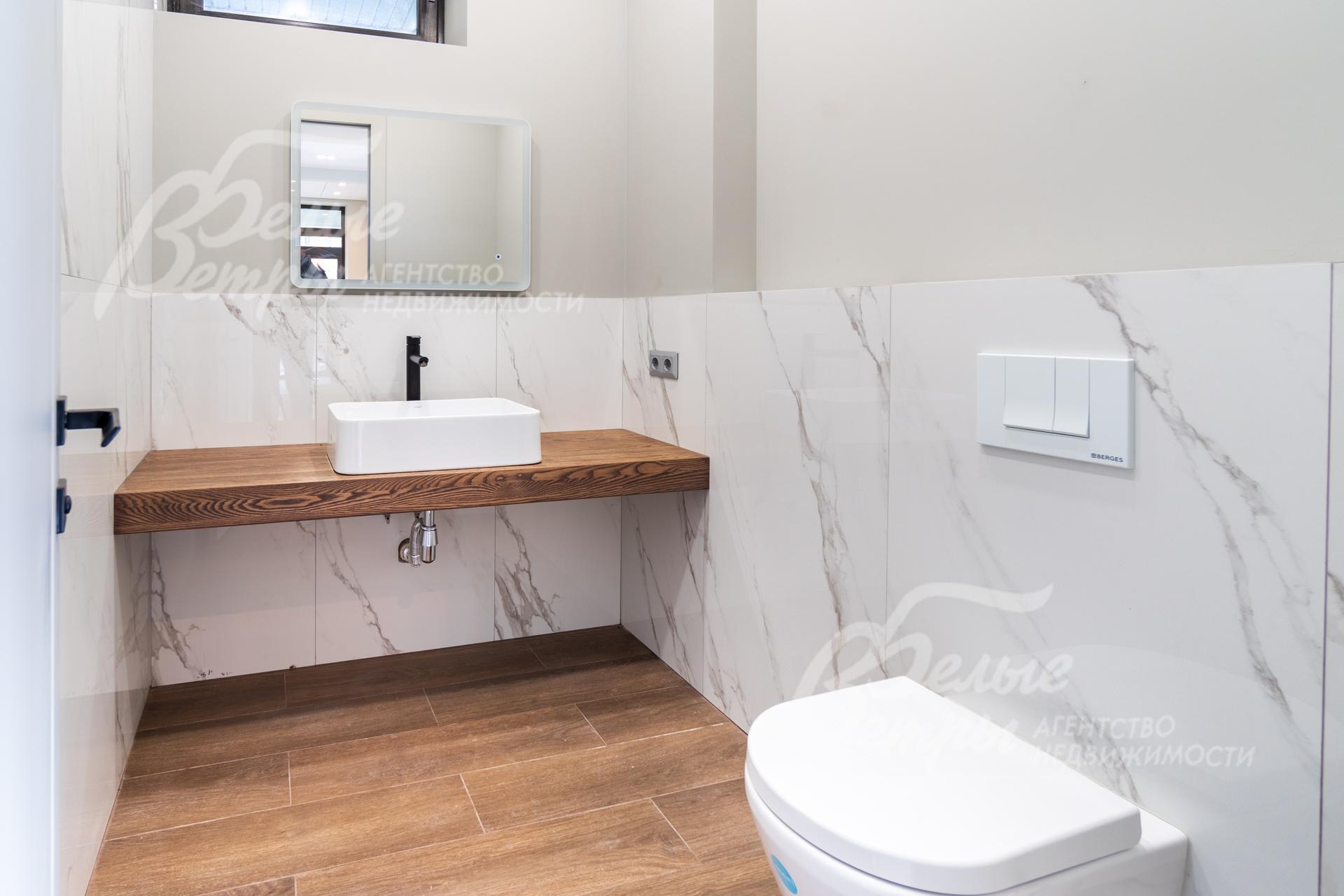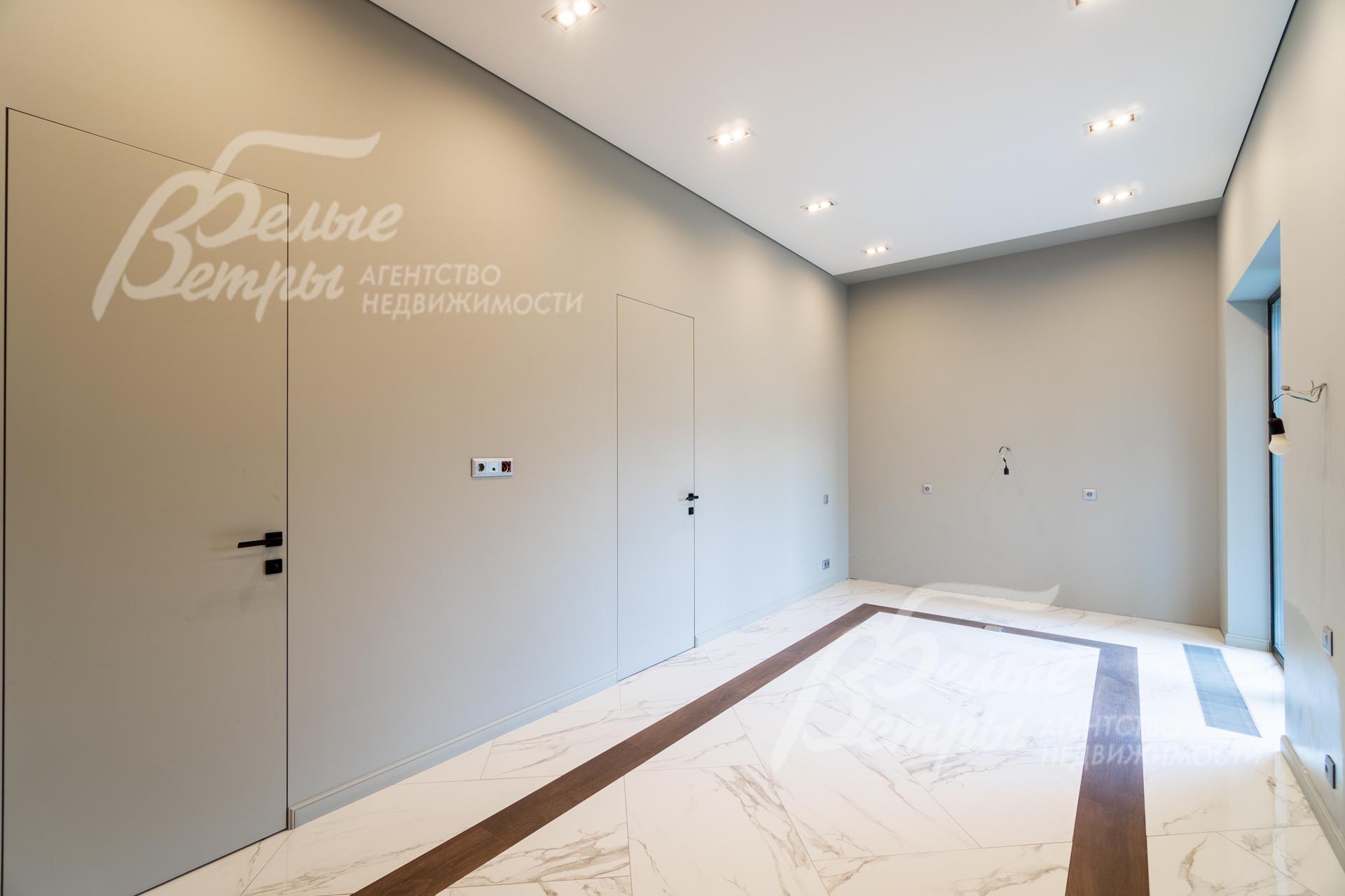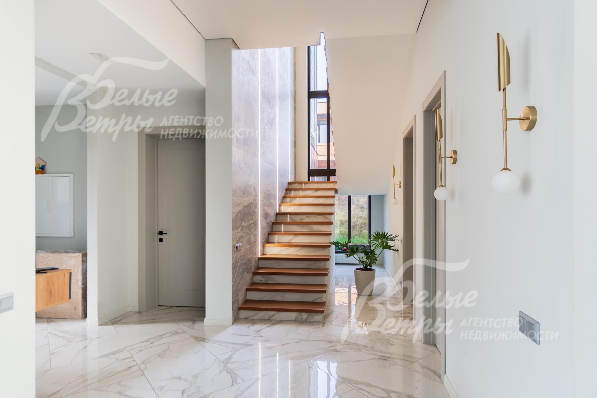 Внутренняя отделка: Дизайнерская отделка в стиле Современный Модерн. На стенах декоративная штукатурка, окраска, в санузлах - плитка Laparet. В отделке использованы дизайнерские элементы из дерева, 3D элементы, различные ниши со скрытой подсветкой, зеркала и т.д. На полу керамогранит с водяным подогревом (все санузлы, прихожая, холл, зона кухни и зона гостиной); паркетная дубовая доска - все спальни и холл второго этажа. Потолки подвесные ГКЛ разноуровневые и натяжные (французские) с дизайнерскими элементами и различной подсветкой (скрытая светодиодная, точечные споты, движущиеся споты на рейлингах, люстры). Вся сантехника от ведущих брендов. Душевые со встроенной системой слива в пол и со стеклянными дверцами. Все коммуникации разведены, конвекторы встроенные польные, электрика АВВ (Германия). Двери деревянные эмалированные и двери скрытого монтажа высотой 2.3 м, подоконники из массива ореха..