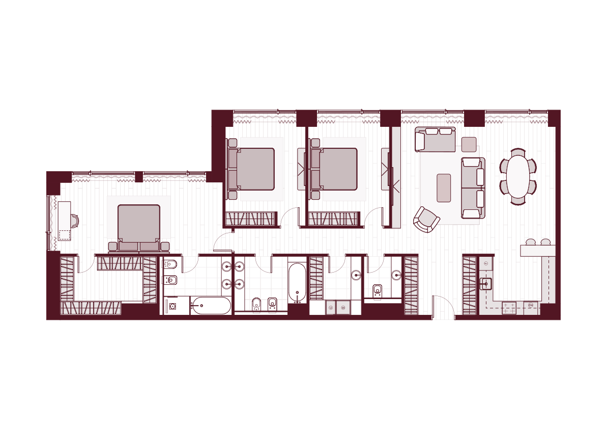 Входная зона с вместительными шкафами, гостевой с/у, кухня с итальянским гарнитуром и всей необходимой техникой, уютная гостиная-столовая, 2 спальни, кабинет, гардеробная комната, 2 полноценных с/у, постирочная со стиральной и сушильной машинами«Miele»,