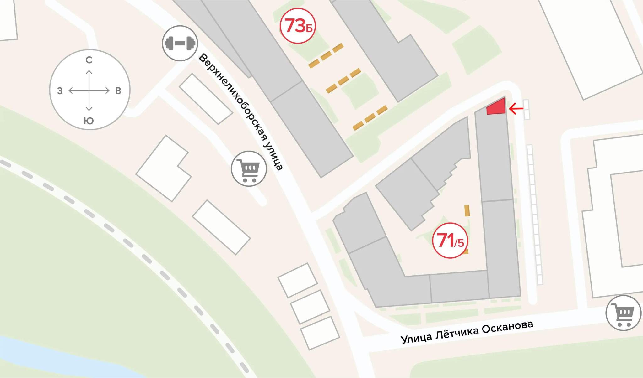 У каждого помещения есть отдельный вход, место под вывеску и витринное остекление, возможно объединить несколько лотов при необходимости. Площади для аренды - от 30,2 кв. м до 493,8 кв. м.
