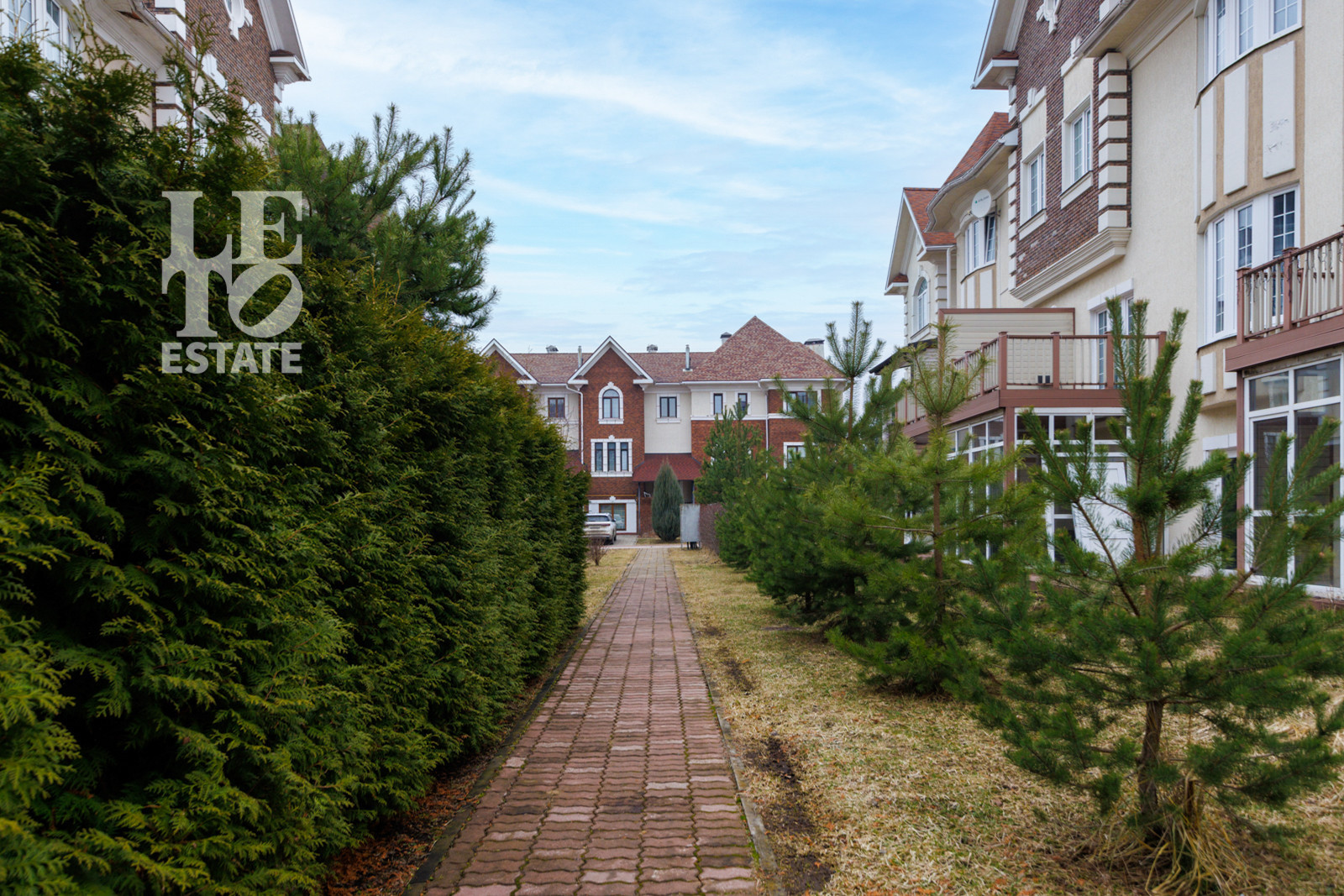 Таунхаус трехэтажный, построен в английском стиле. Во входной группе организовано высокое крыльцо с кованым ограждением. Тамбур на входе в таунхаус остеклен. Есть гараж на два машиноместа и две террасы, одна из которых закрытая. Во всех санузлах организована система теплого пола. На полу на третьем этаже постелен ковролин. Таунхаус расположен рядом с парком.