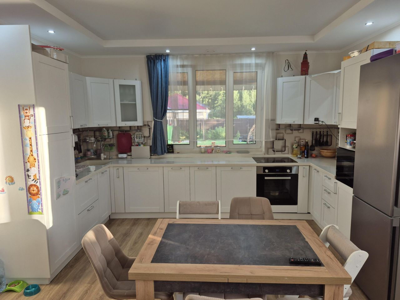 Ремонт завершен в 2025 году и выполнен в современном минималистичном стиле. Планировочное решение позволяют максимально эффективно и функционально использовать все пространство дома, а панорамные окна визуально добавляют пространства. Рядом со входом в дом имеется небольшое подсобное помещение для различного инвентаря или велосипедов.