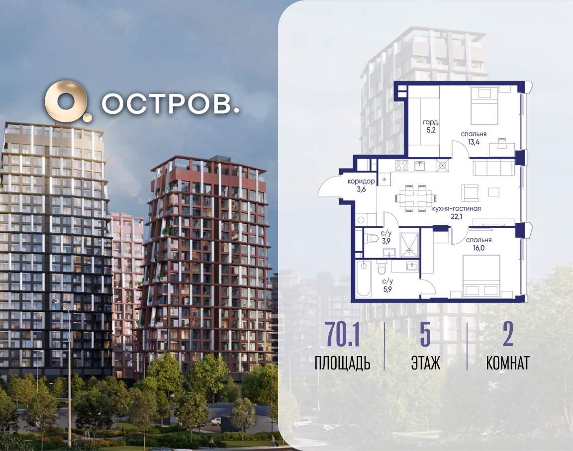 Продаётся 2-комн. квартира от застройщика: общая площадь 70.10 м, жилая 29.40 м, кухня 22.10 м, 5-й этаж, жилой квартал «Остров 14», корпус 4 (секция 1) . Срок сдачи: 2 квартал 2029 года.