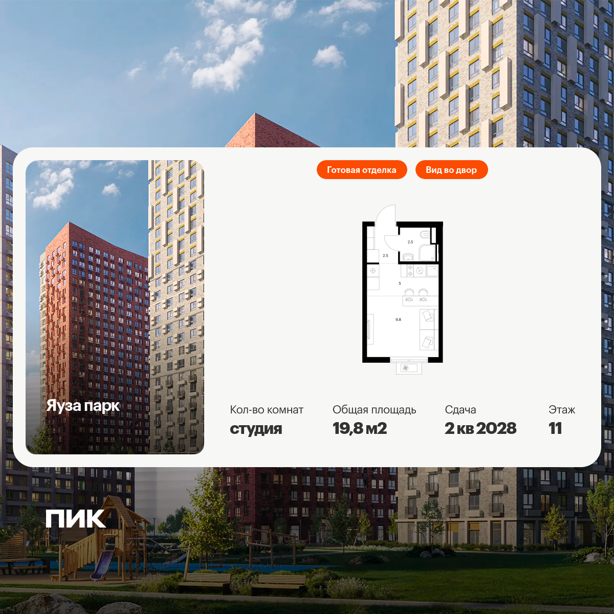 Продаётся квартира-студия площадью 19.90 кв.м на 11 этаже 15 этажного дома (Корпус 16.2, секция 6) проекта ПИК Белая Дача парк. Светлый просторный подъезд на уровне земли, функциональная планировка, большие окна, с отделкой.