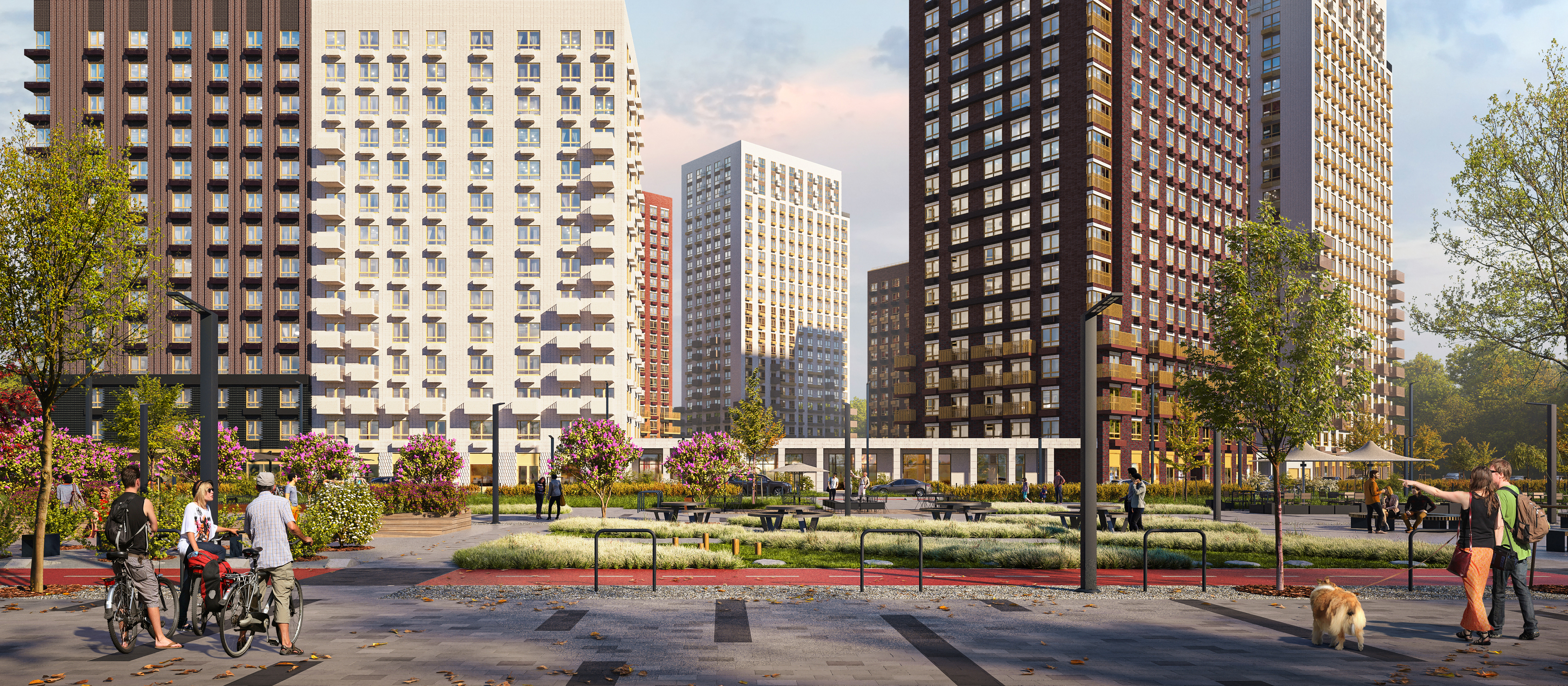 Каждый дом в проекте уникален. Фасады будут окрашены в природные цвета и дополнены разными рельефными элементами. Два самых высоких корпуса станут архитектурными доминантами со скульптурными силуэтами и выемками, похожими на горные уступы.