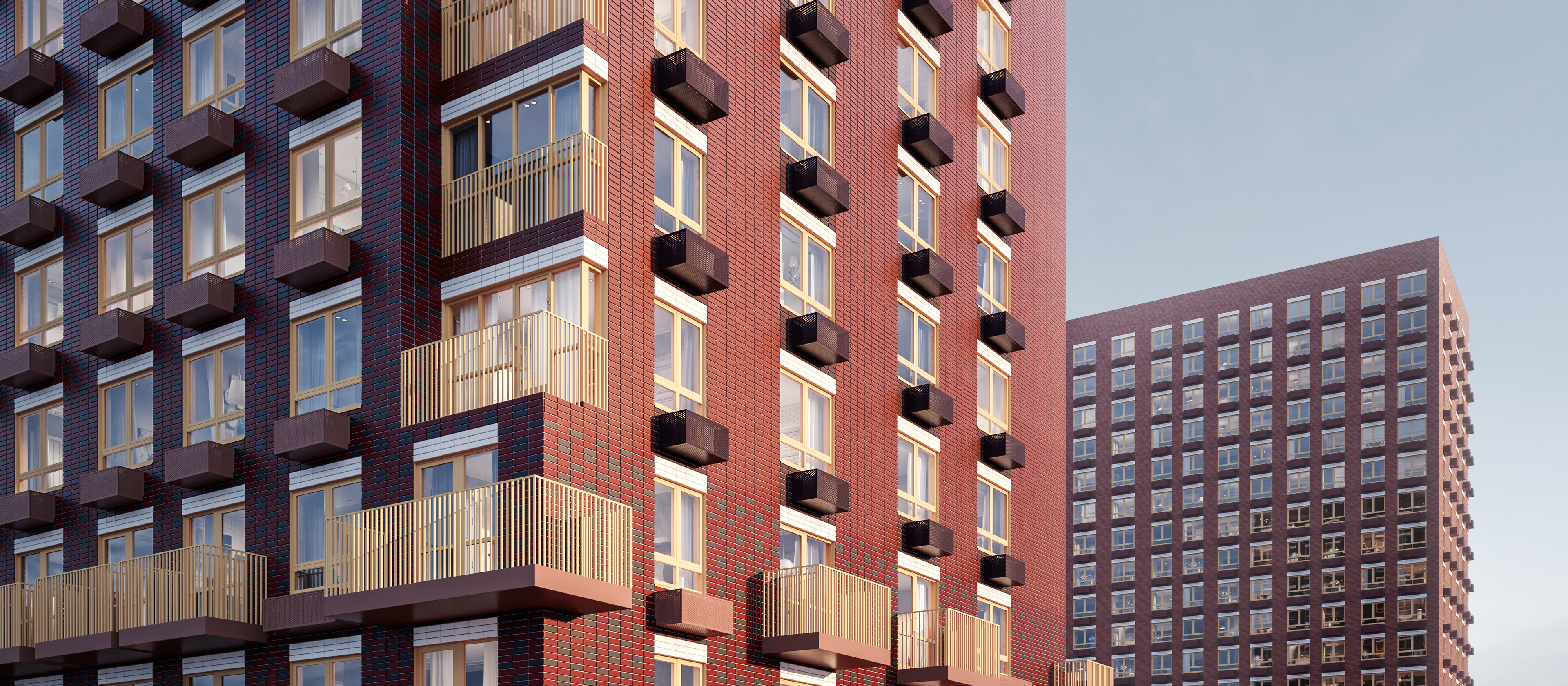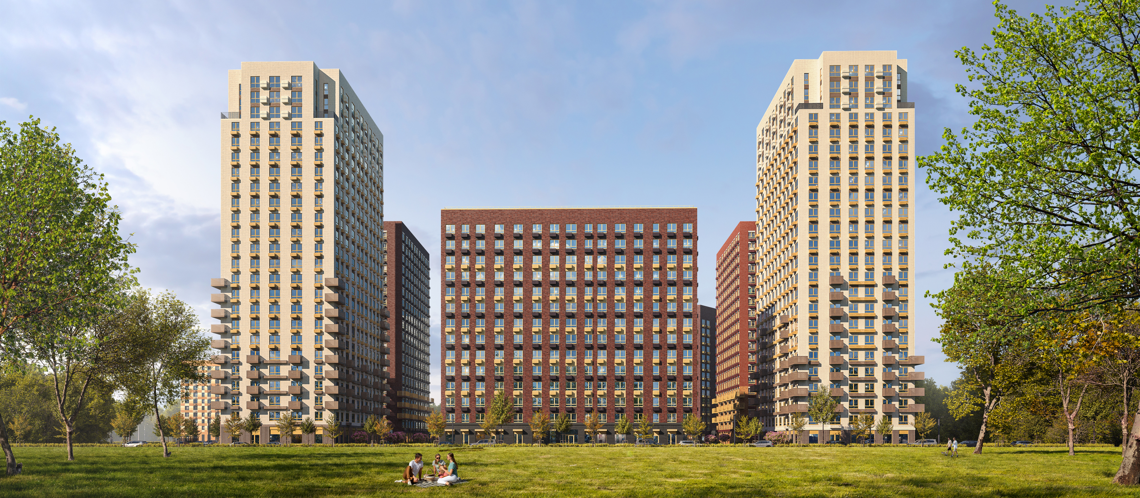 Каждый дом в проекте уникален. Фасады будут окрашены в природные цвета и дополнены разными рельефными элементами. Два самых высоких корпуса станут архитектурными доминантами со скульптурными силуэтами и выемками, похожими на горные уступы.
