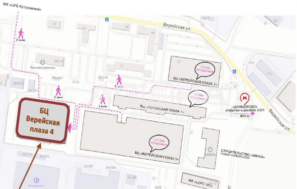 Развитая инфраструктура: в деловом комплексе, состоящем из нескольких корпусов, расположены кафе и рестораны, магазины, салон красоты и медицинский центр, отделения банков и т.д. Общая площадь бизнес-центра 50 000 кв.м., 7 этажей. В БЦ Верейская плаза 4 работают более 2 000 сотрудников офисов, 43 800 м2 офисных помещений.