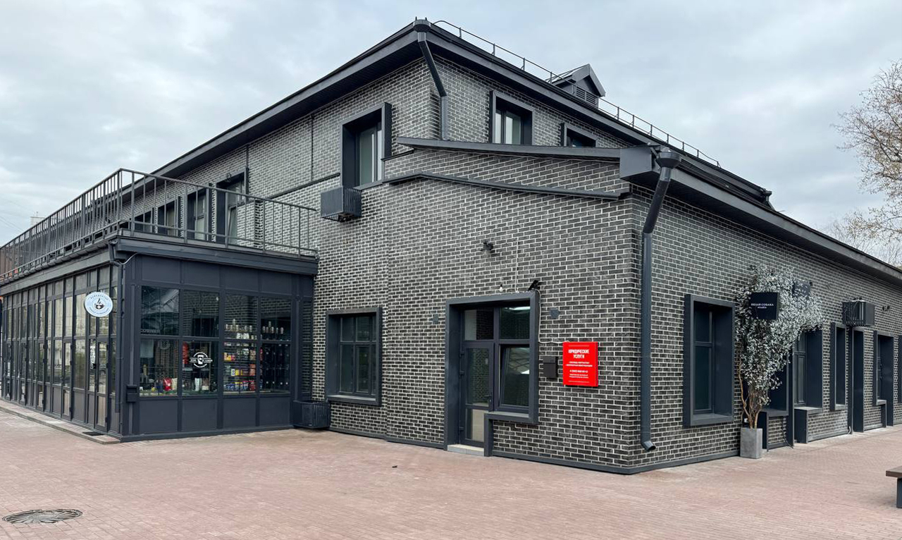 Отделка фасадов выполнена панелями с имитацией клинкерного кирпича. Дополнительно на территории организованы зоны отдыха, также дополнительно имеется возможность для организации летних веранд и кафе.