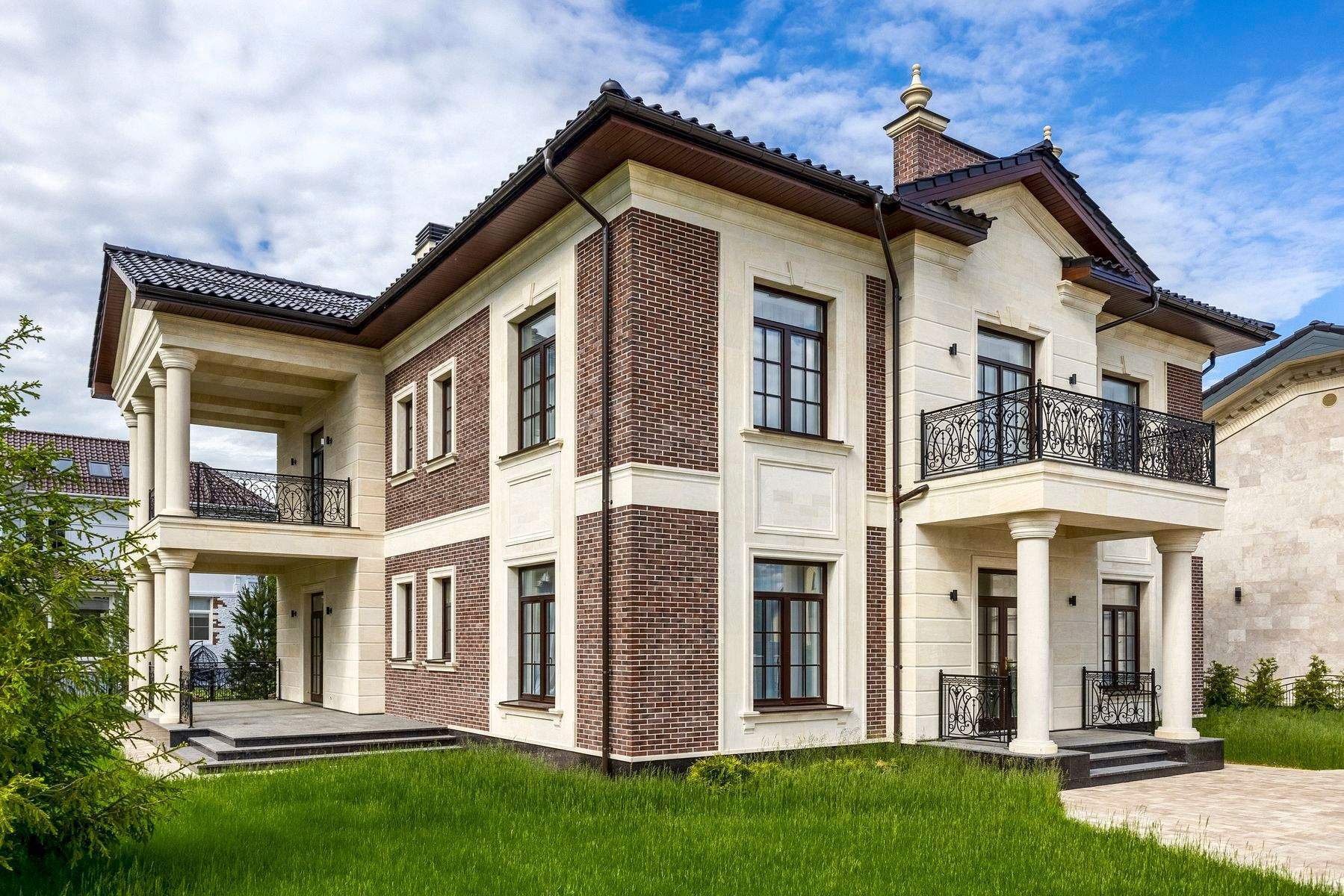 Мастер-спальня выходит на террасу. В основе дома лежит кирпично-монолитная конструкция- одна из самых прочных и долговечных.