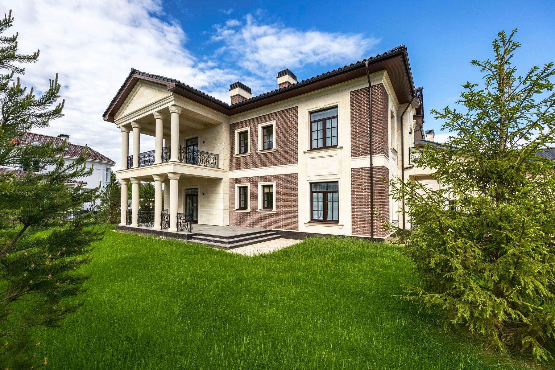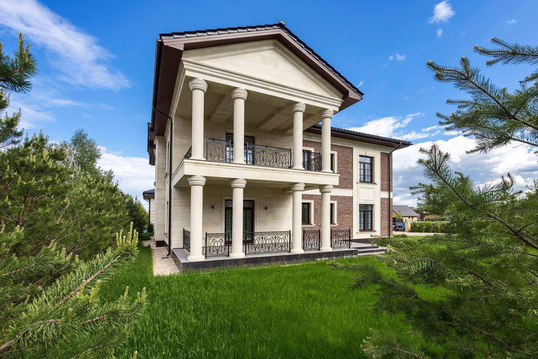 На участке выполнен ландшафтный дизайн, растут густые ели.