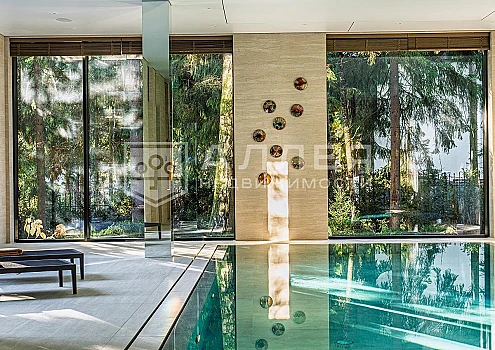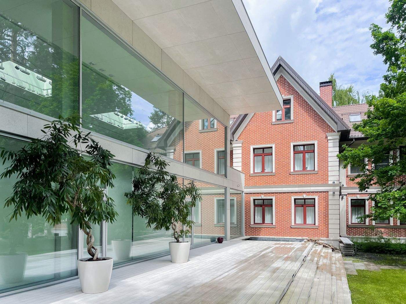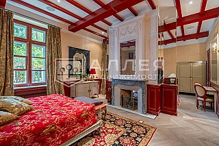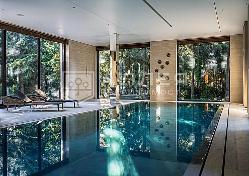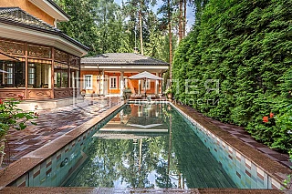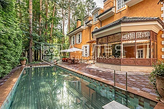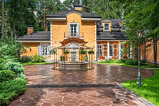 Просторная загородная резиденция площадью 1100 м построена на участке 50 соток в окружении сосен. К фасаду основного здания, выполненногов английском стиле из красного клинкерного кирпича, примыкает современная постройка из стекла и бетона. Интерьер эклектичен под стать архитектуре дома - здесь сочетаются полы из мрамора и версальский паркет, дверные порталы в духе арт-деко, мебель 13 века и винтаж 60-х годов. Высота потолков достигает 7 метров.