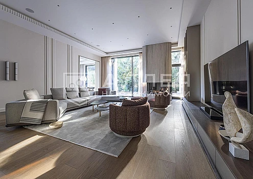 В особняке спланировали 6 спален, единое пространство из гостиной с камином, столовой и кухни, кабинет, зону отдыха с сауной и хамамом, холл со вторым светом, передающий атмосферу старых парижских домов.