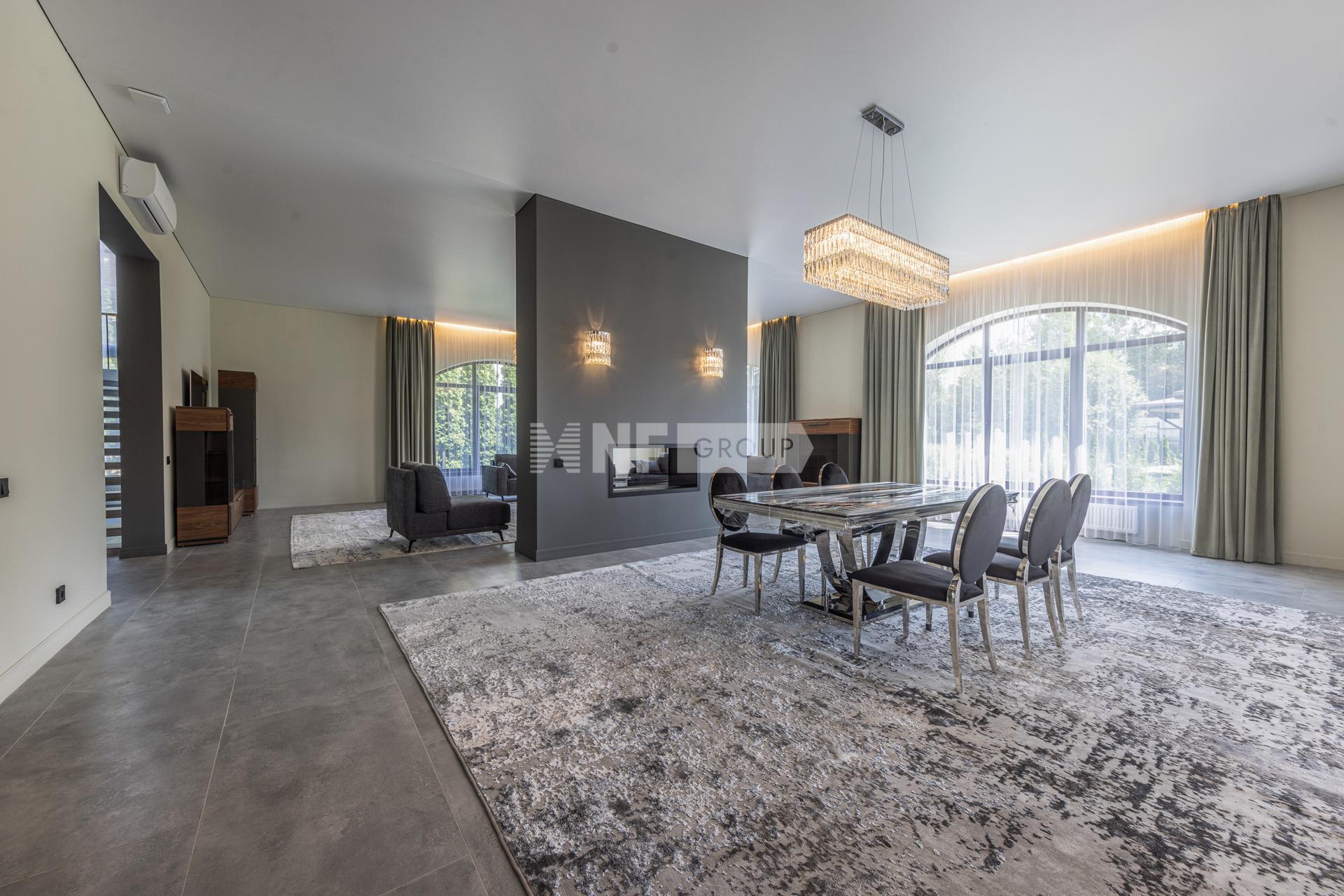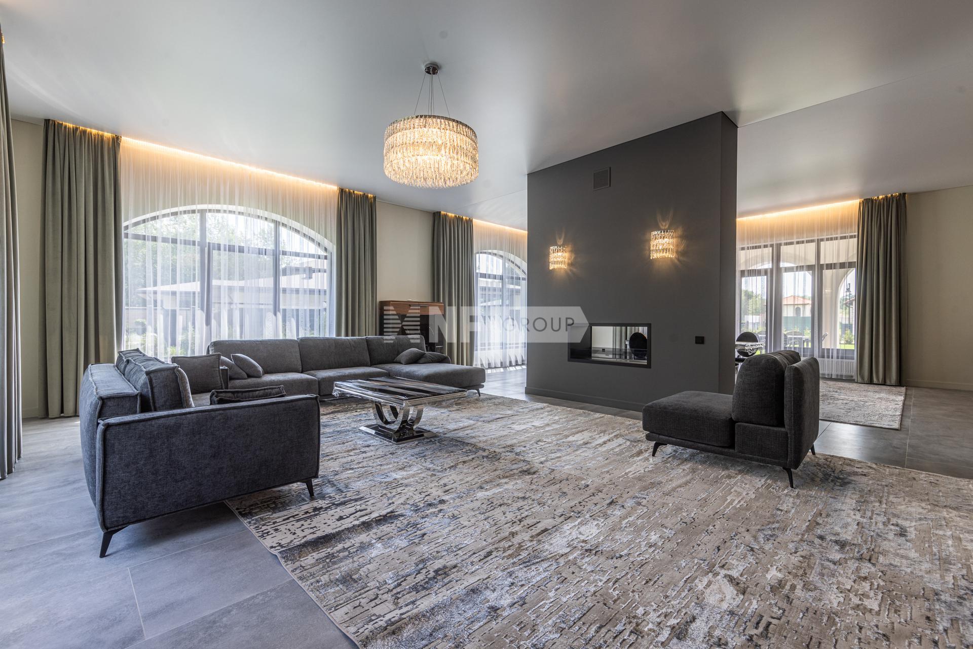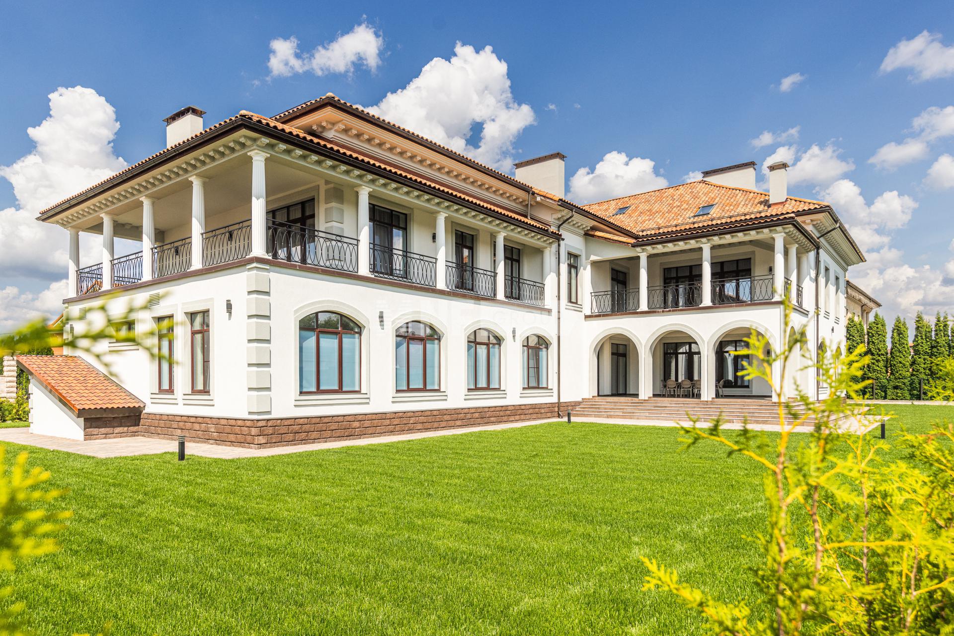 Просторный загородный дом площадью 1300 м построен на ровном полевом участке 15 соток без ландшафтного дизайна. Фасад в европейском стиле облицован коричневой клинкерной плиткой и натуральным камнем по цоколю, декорирован белыми наличниками и колоннами. В коттедже без отделки спланировали несколько спален, гостиную, кухню, кабинет, кинотеатр, спортзал, парилку и гараж. Укрыться от солнца и отдохнуть на свежем воздухе можно в тени террасы с видом на участок или в беседке.