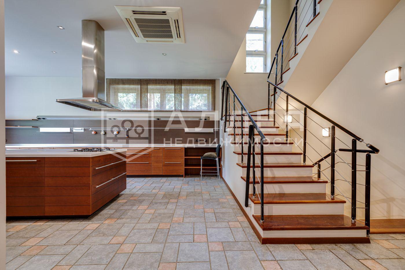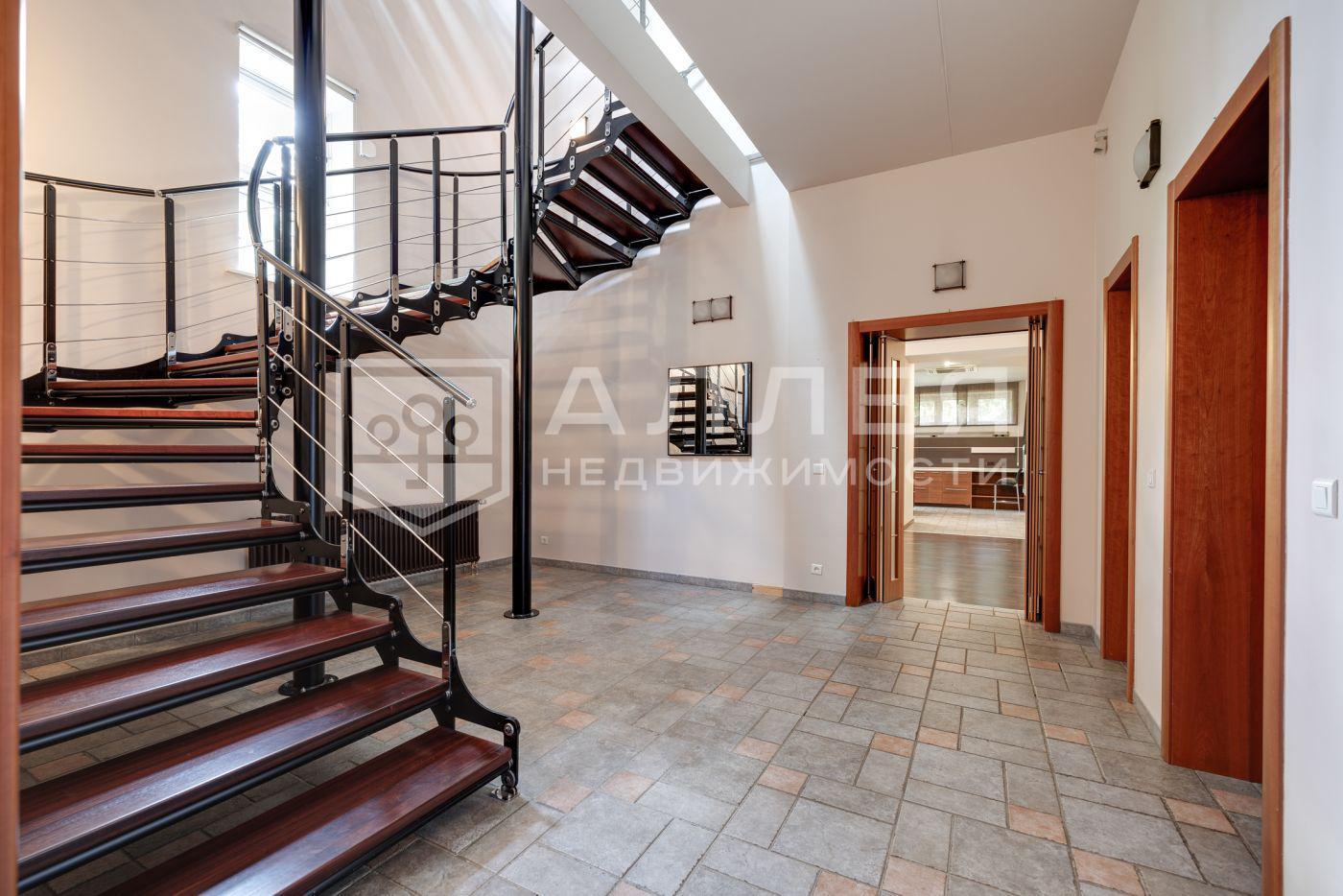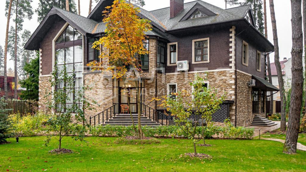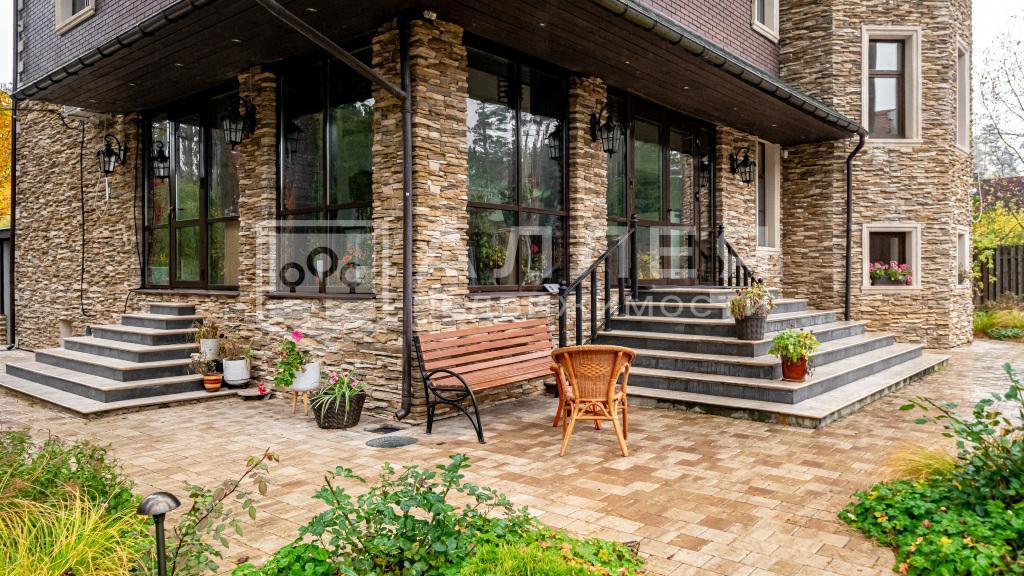Дом площадью 669 м с элементами стиля «модерн» расположен на открытом участке 11 соток. Фасад облицован натуральным камнем и украшен мозаикой.