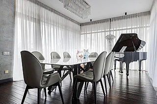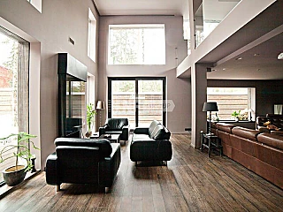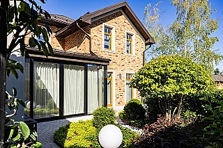 Загородный дом площадью 427 м построен на полевом участке 28 соток. Фасад здания облицован бежевыми панелями и декорирован серым клинкерным камнем.