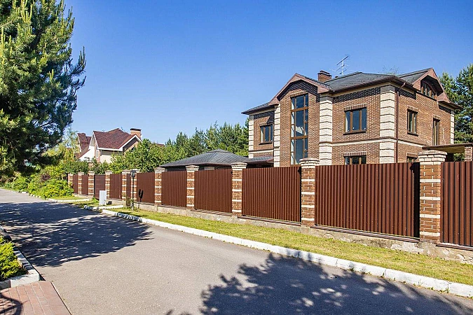 Планировкой резиденции предусмотрены 4 спальни, просторная гостиная, переходящая в зону кухни-столовой, кабинет. В контуре дома расположен гараж на 2 машины. На участке растут хвойные деревья.