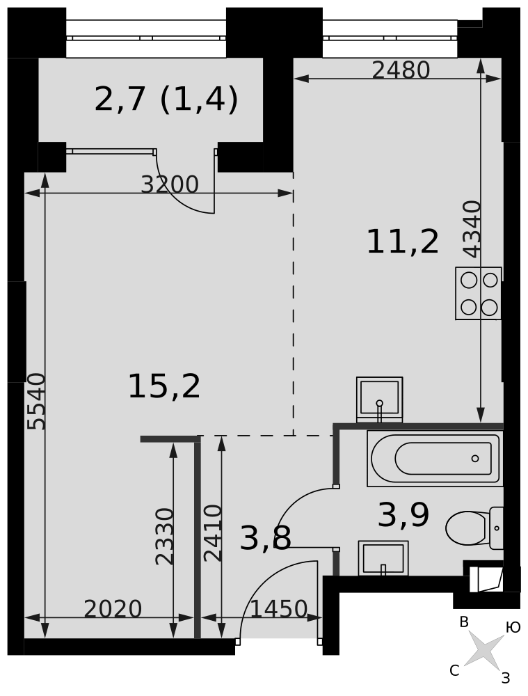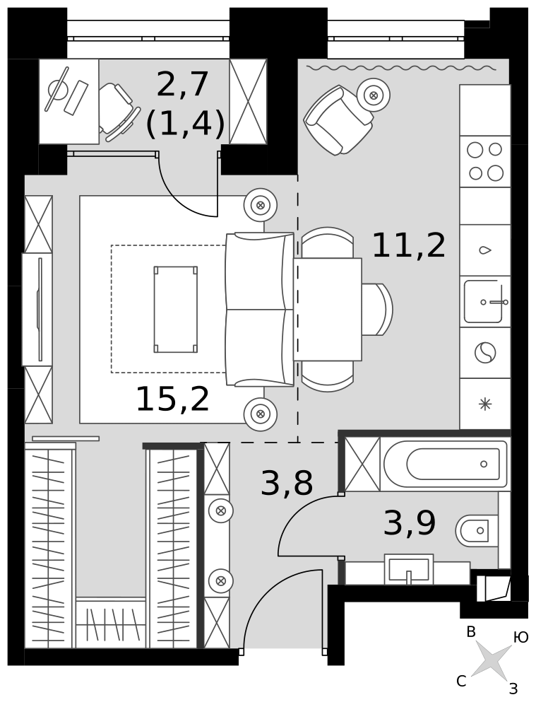 Общая площадь квартиры 31.78 кв.м. и имеет выделенную спальню ,зону гостинной и кухни, встроенный шкаф в прихожей, совмещенный санузел с душевой кабиной.