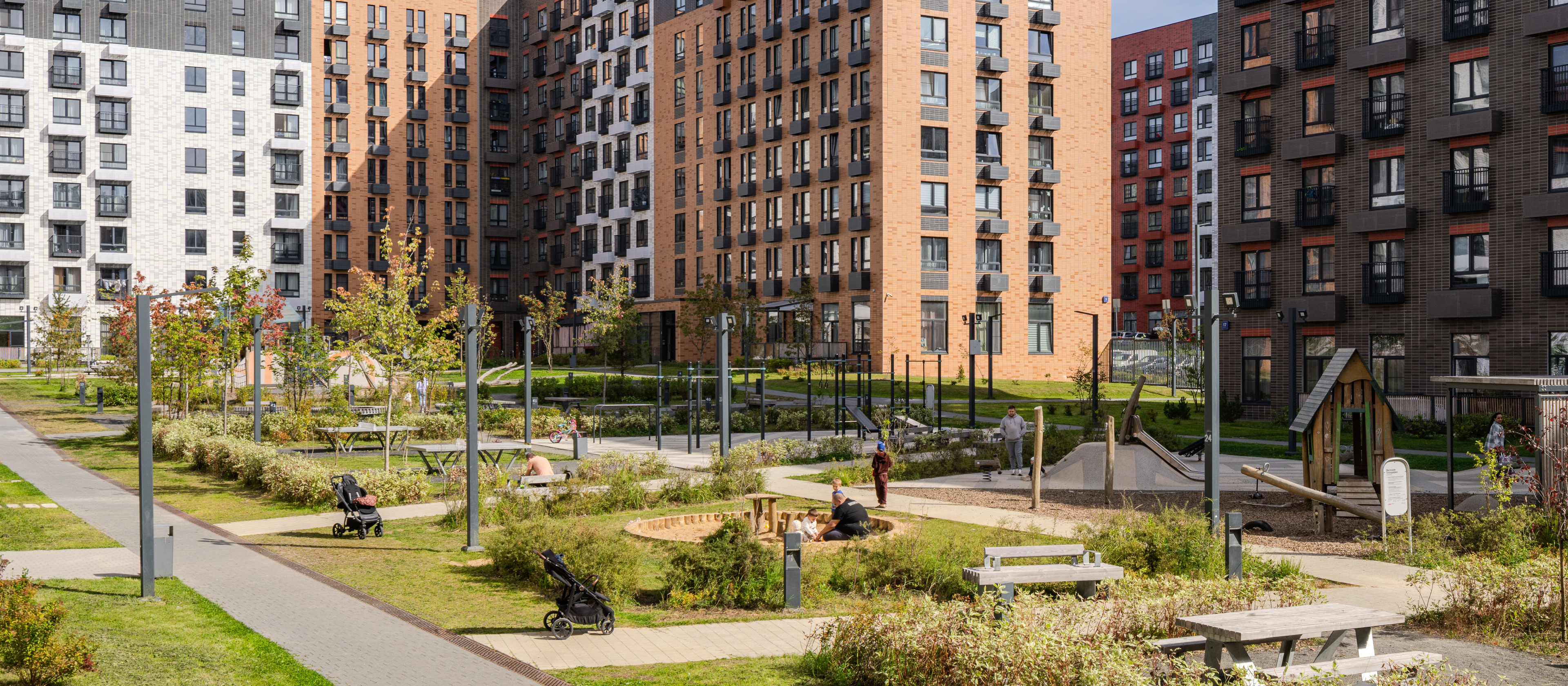 Уже открыто общественное пространство для прогулок, отдыха и встреч жителей: есть игровые площадки, места для отдыха, пешеходные маршруты и велопарковка. На первых этажах домов работают кафе, магазины, аптеки, медицинские центры и пункты выдачи онлайн-магазинов.