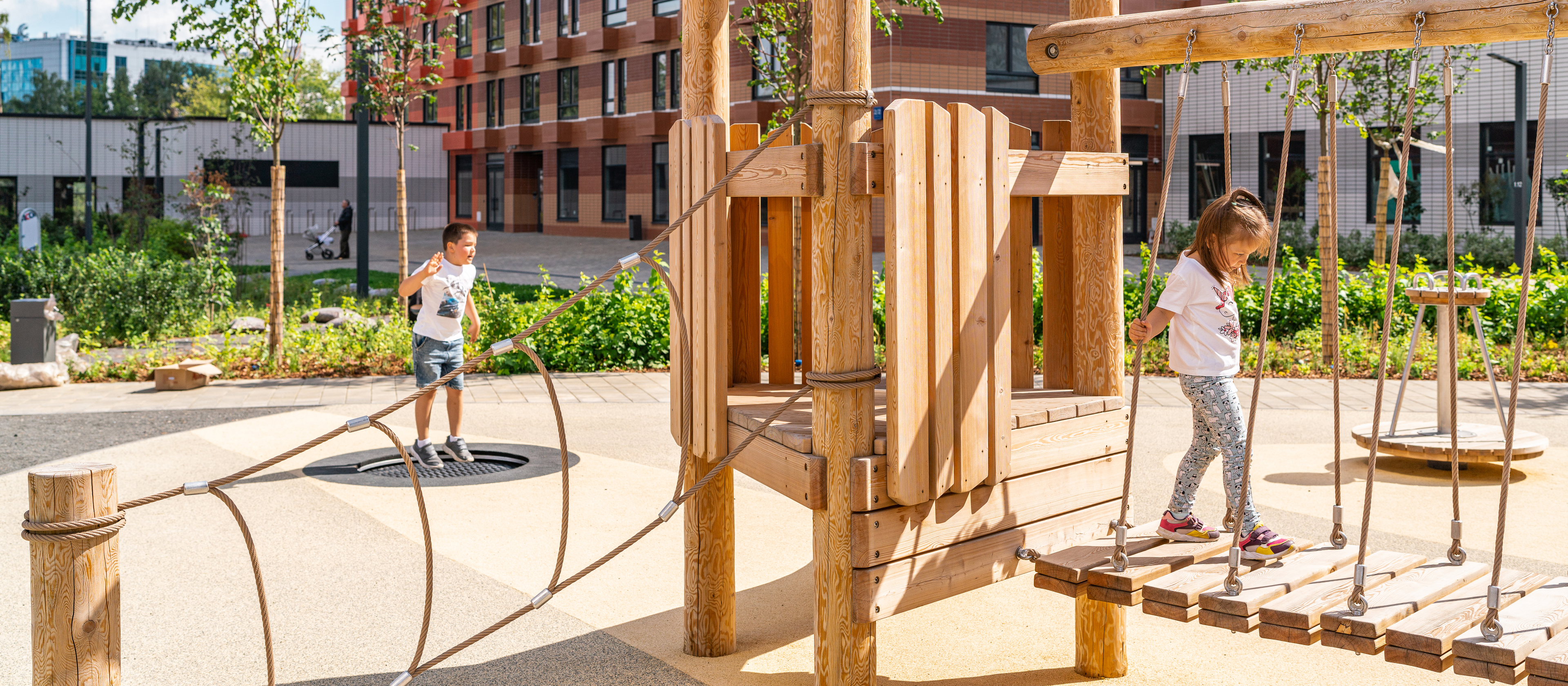 Во дворе дома детские и спортивный площадки, высажены деревья цветы и кустарники.